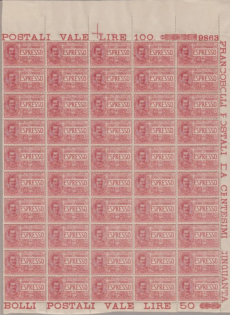 1920 ITALIEN - KÖNIGREICH, Espresso Nr. 4 Blatt von 50 MNH / ** TISCHNUMMER