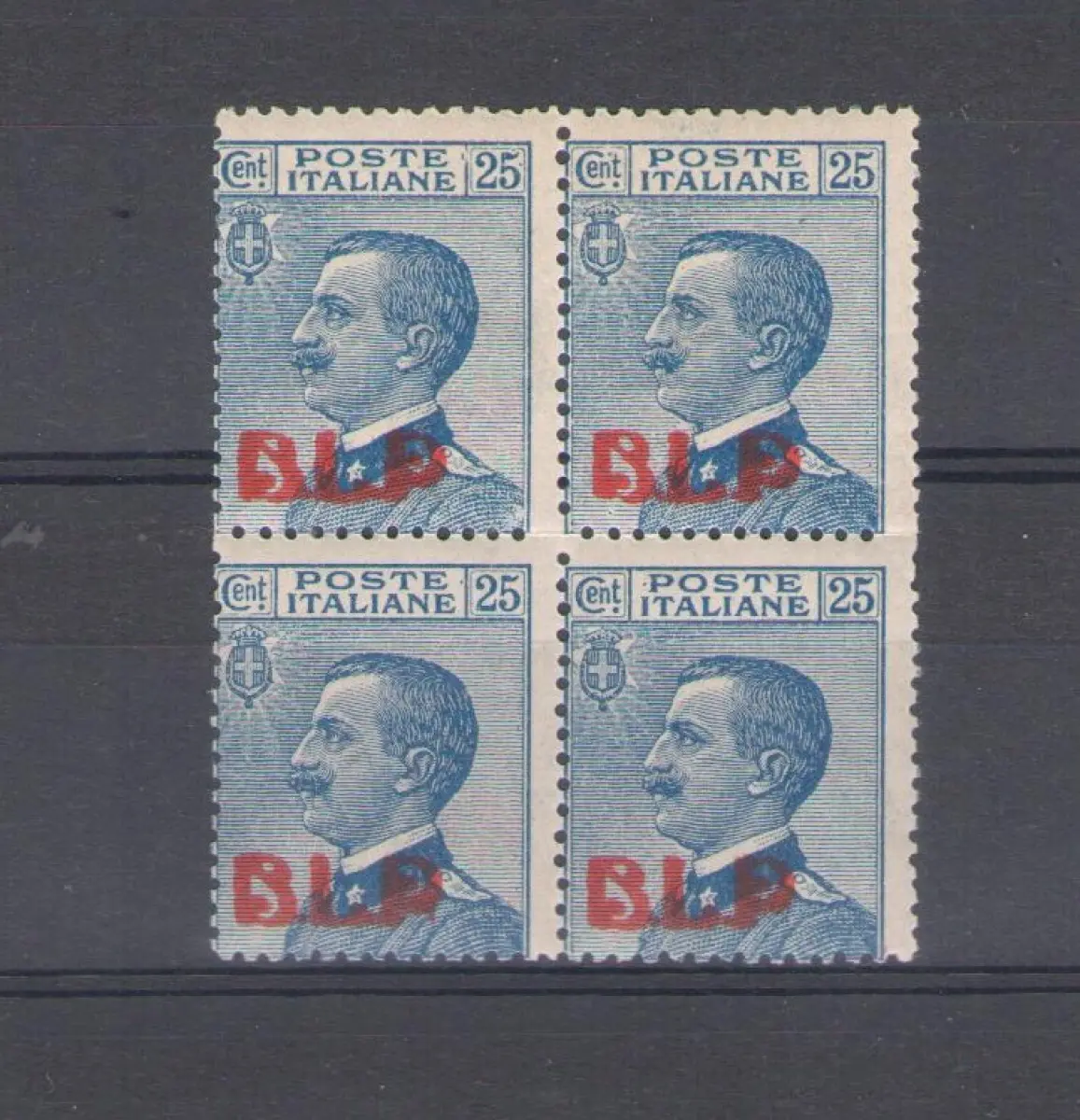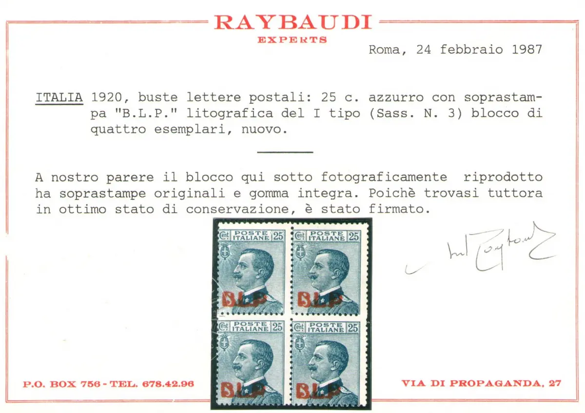 1921 Königreich Italien, BLP Nr. 3, 25 Cent Blau, lithographischer Aufdruck I Typ, Mittelmäßige Zentrierung, MNH ** - Raybaudi-Zertifikat - Quartina Vollgummi und Original - ohne Linguella - Not Hinged Lot Claudio Sächsischer Katalog 2022 - Nr. 3 Euro 2.000 - ROTE BOX AUSSEN