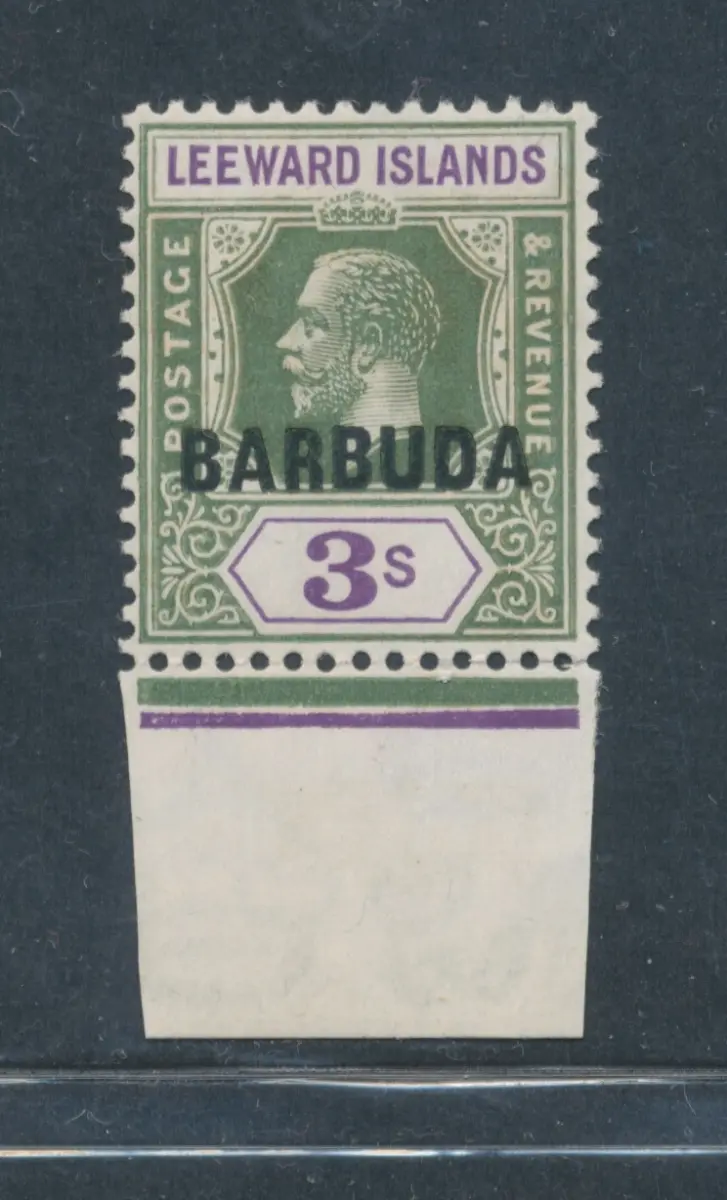 1922 Barbuda - Stanley Gibbons Nr. 7 - 3 Schilling hellgrün und violett MNH ** Stanley Gibbons Katalog 2022 £ 40 Lotto 301-5