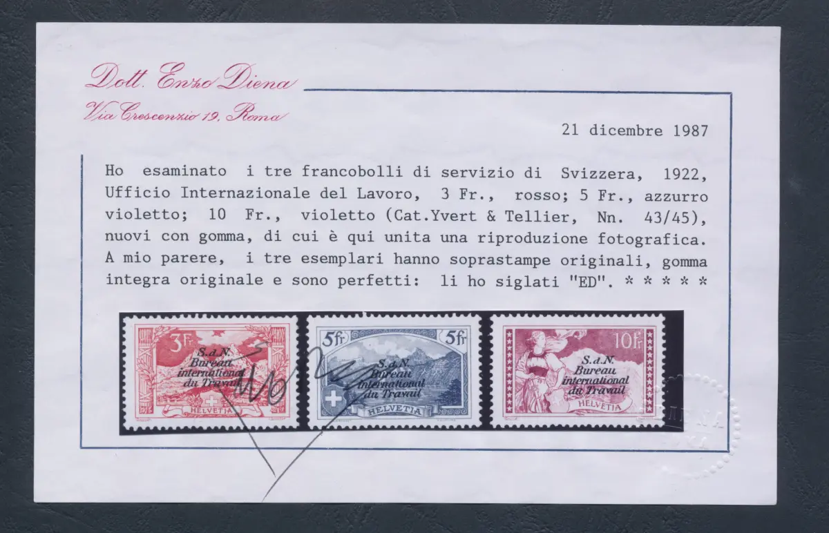 1923 SCHWEIZ - Serv. 43/45 3 Werte MNH/**Zert. Diena SDN Bureau International du Travail, HOHE WERTE VOLLGUMMI Einheitskatalog Euro 2.000 A/ARM