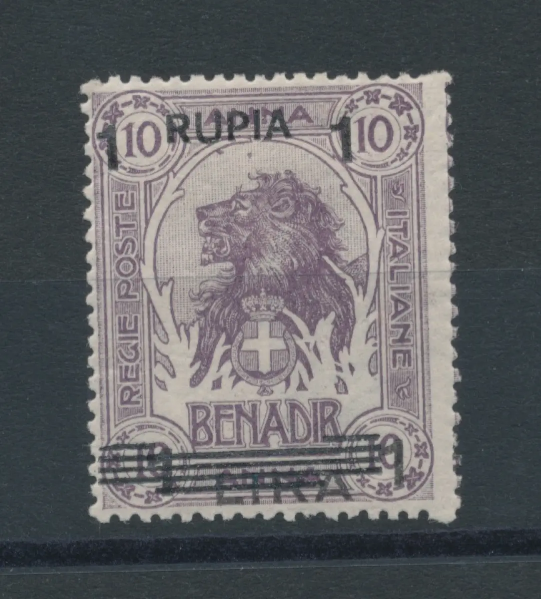 1923 SOMALIA, Nr. 44Dc, Löwe überdruckt, stark nach links verschobene Überdrucksorte, postfrisch** Die starke Verschiebung lässt die in den oberen Ecken befindlichen Ziffern '10' des Originalwertes vollständig offen (zitiert und katalogisiert auf dem sächsischen Fachgebiet) Sächsischer Katalog Euro 900 ORIGINAL VOLLGUMMI BOX SCHWARZ KOLONIEN