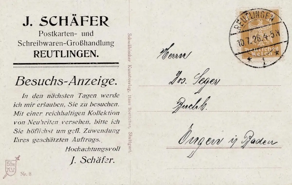 1926: Reutlingen: Schreibwaren Großhandlung - Ansicht: Ich gratuliere-Uniform