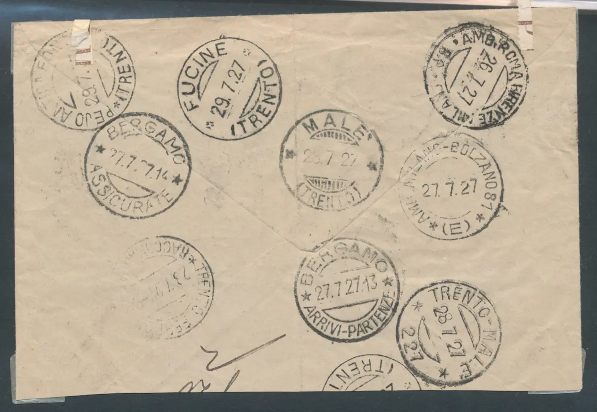 Der Umschlag wird immer mit Briefmarken in Lire oder Euro frankiert, um ein philatelistisches Porto zusammenzustellen.
