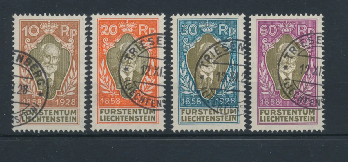 1928 Liechtenstein, Nr. 82/85, 70. Adventstag Fürst Johannes II., 4 Val, gebraucht mit Linguella. Bruch 4 von 8 Werten Einheitskatalog Euro 135,00 Auslandskarton