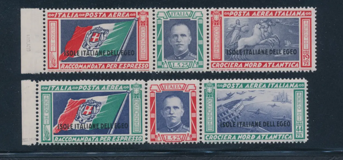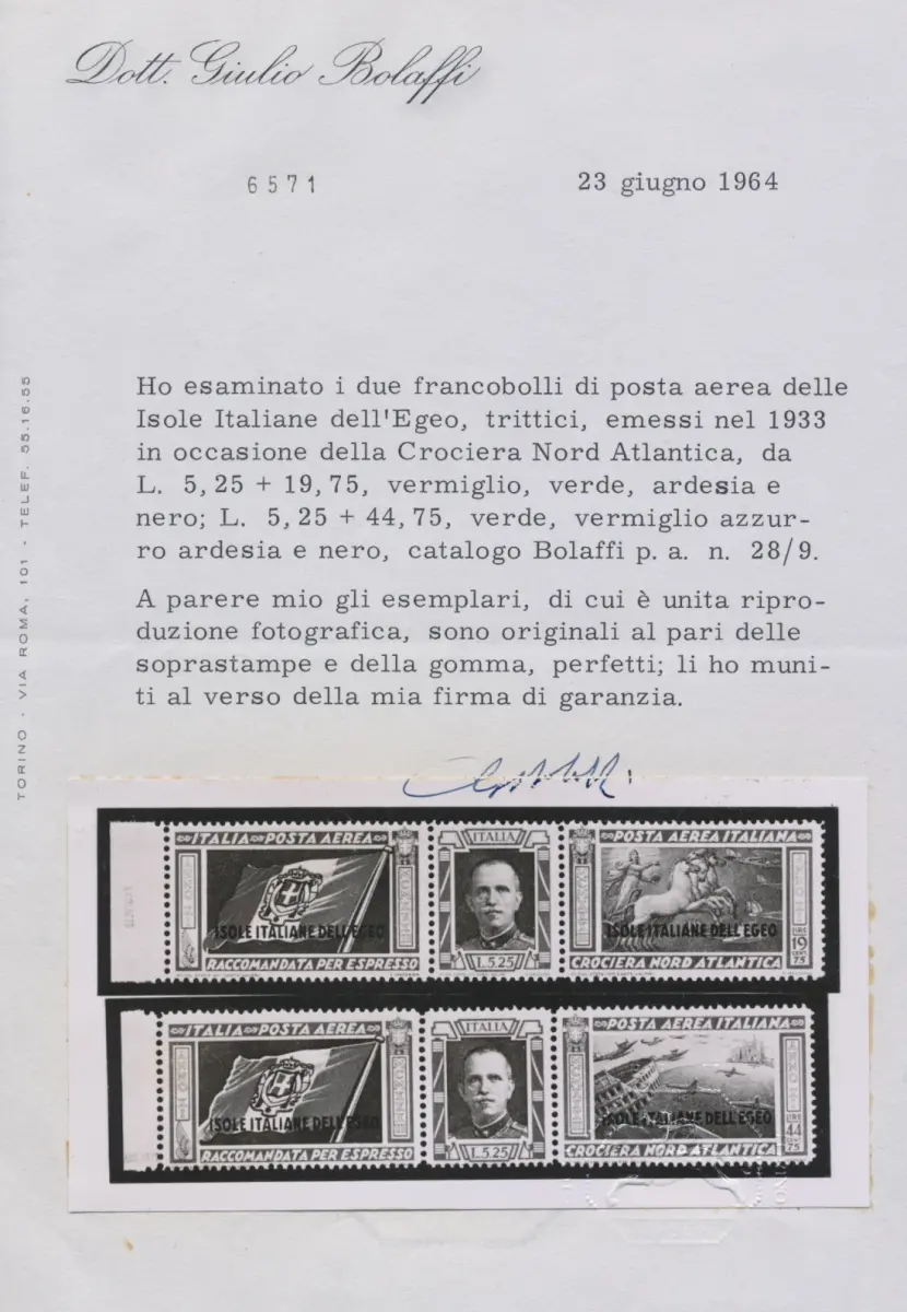 1933 ÄGÄIS, Luftpost - Tripttici Balbo 28/29 MNH ** Signatur Bolaffi + Zertifikat Wert von 5,25 Lire + 44,75 signiert Bolaffi und Historisches Zertifikat Bolaffi Sächsischer Katalog Euro 600 Soc Mario Album grün