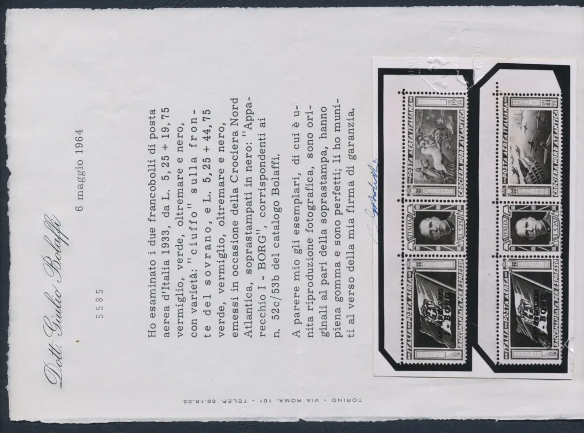 1933 Italien - Königreich, Luftpost Nr. 51 Da/52 - Tripttici Borg mit Büschelsorte, postfrisch ** Historisches Zertifikat Giulio Bolaffi Sächsischer Katalog Euro 3000 Album grün Soc. Mario