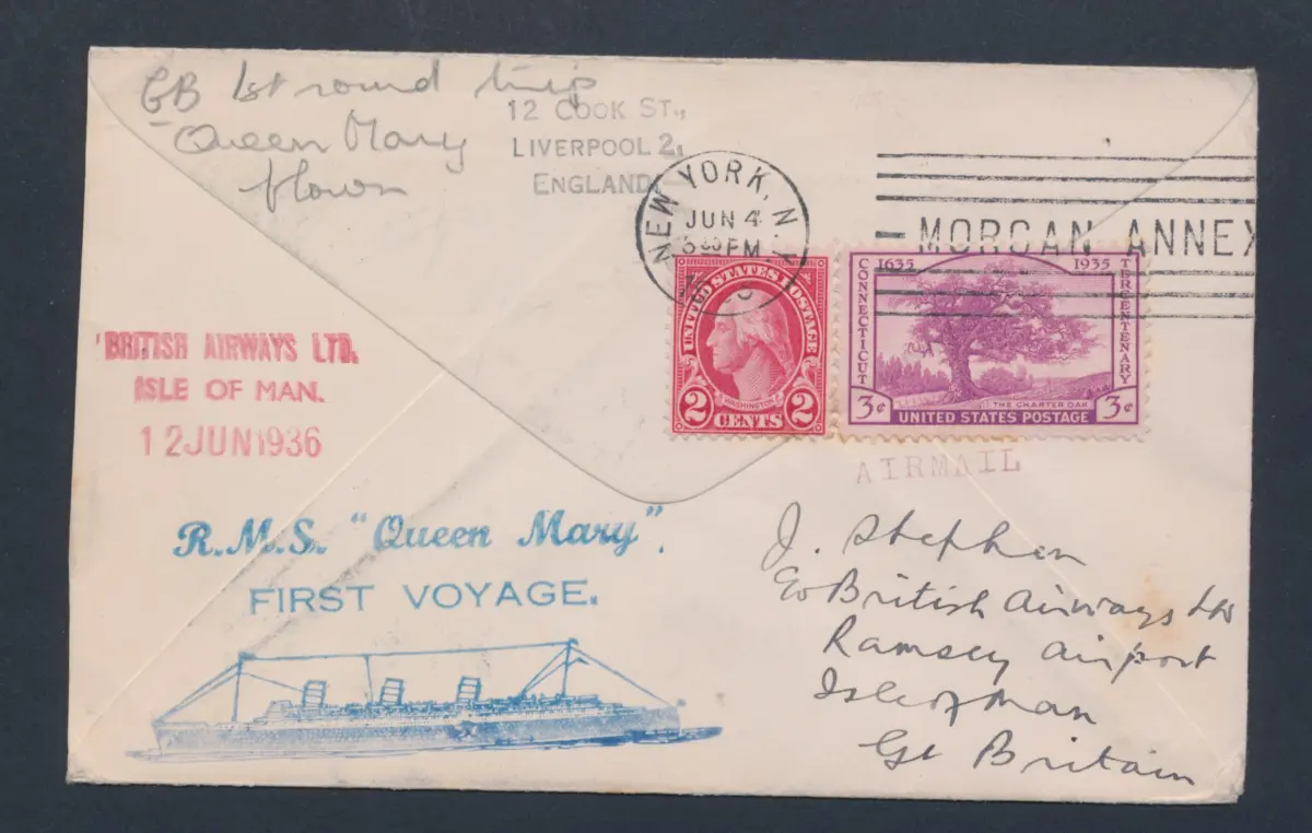 1936 Großbritannien, Queen Mary Erste Reise, Southampton - New York und Rückflug per Flugzeug zur Isle of Man Lot 2 Briefe