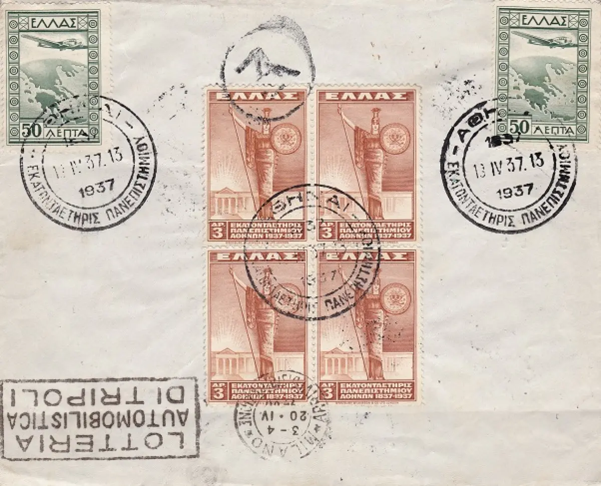 26.10.1946 GRIECHENLAND Nr. 421 Hundertjahrfeier der Universität Athen 3d. viertelgelbbraun auf Brief nach Mailand (Posta Aerea) mit Zusatzfrankatur. Sonderstornierung für die Ausgabe.