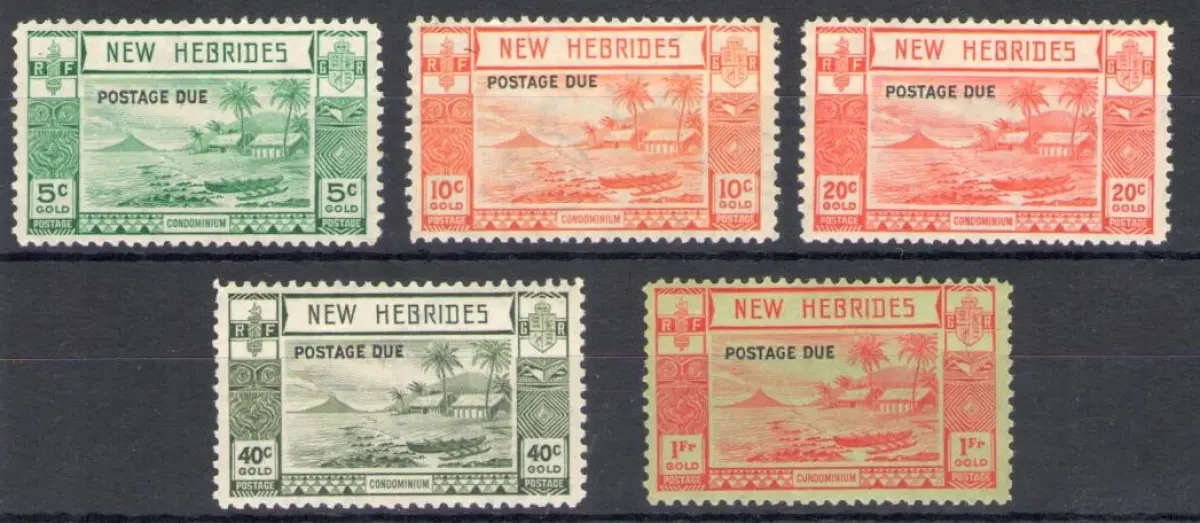 1938 New Hebrides - Stanley Gibbons Nr. D6/D10 - MNH ** Vergilbung auf der Rückseite wie aus Stanley Gibbons 190 Scan - Auslandskarton Kolonien - der von mir angebotene Preis berücksichtigt die Qualität der Serie sehr schön und intakt jedoch mit einigen leichten Vergilbungen