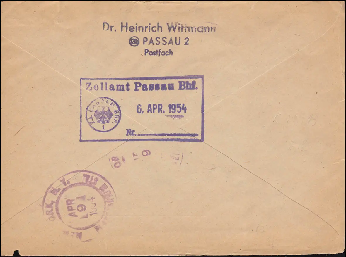 USA-Brief über Zollamt Passau Bhf., Ankunftsstempel New York 9.4.54, Bedarfsmängel an den Rändern laut Abbildung