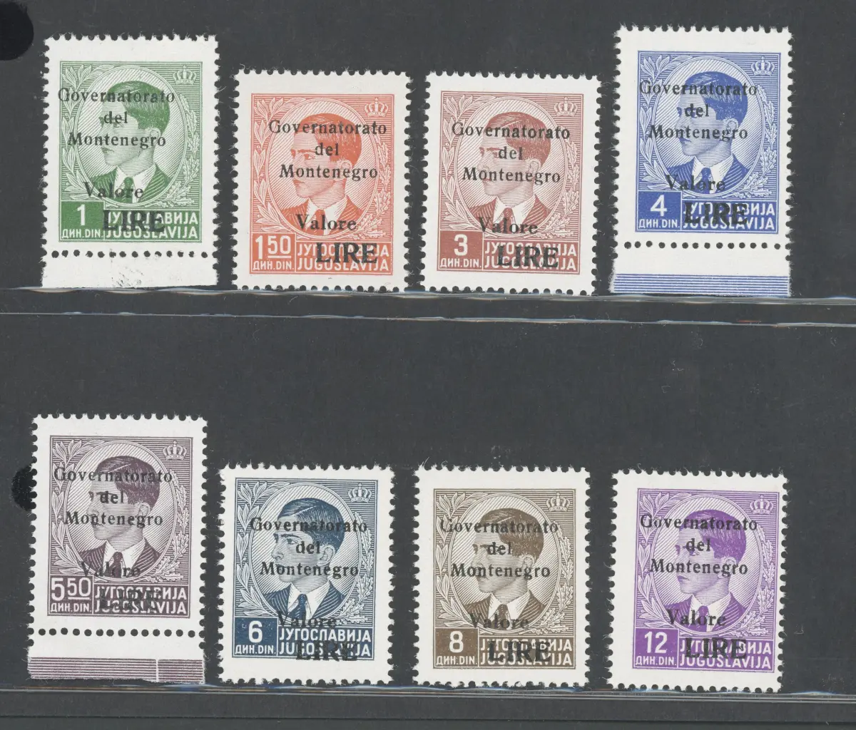 1942 Montenegro, n. 40/47 Serie mit 8 Werten (unvollständig) - postfrisch** Abkürzung - signiert A.Diena (1,50 rote Dinar) Briefmarken Jugoslawien von 1939-40 überdruckt SÄCHSISCHER KATALOG Euro 1.625 schwarze Box Kolonien