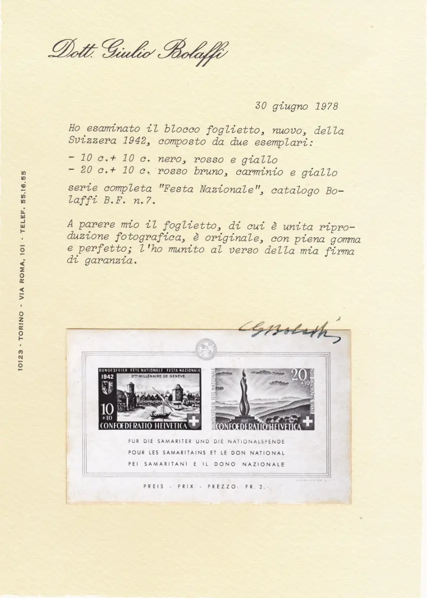 1942 SCHWEIZ, BF Nr. 7 Pro Patria MNH / ** Zertifikat Bolaffi Bimillennium Stadt Genf Euro 110 A Katalog / blaues Album Schweiz