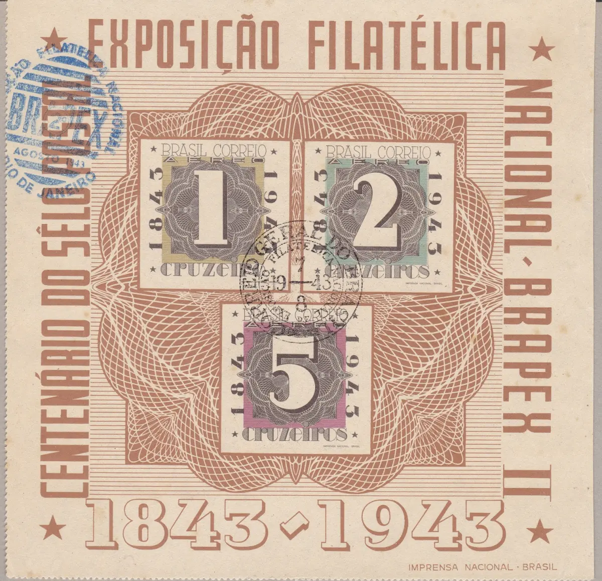 1943 BRASILIEN Yvert BF Nr. 7 BRAPEX ANNULLIERUNG ERSTER TAG Hundertjahrfeier der Briefmarke Yvert Tellier Euro 65 Lot 89
