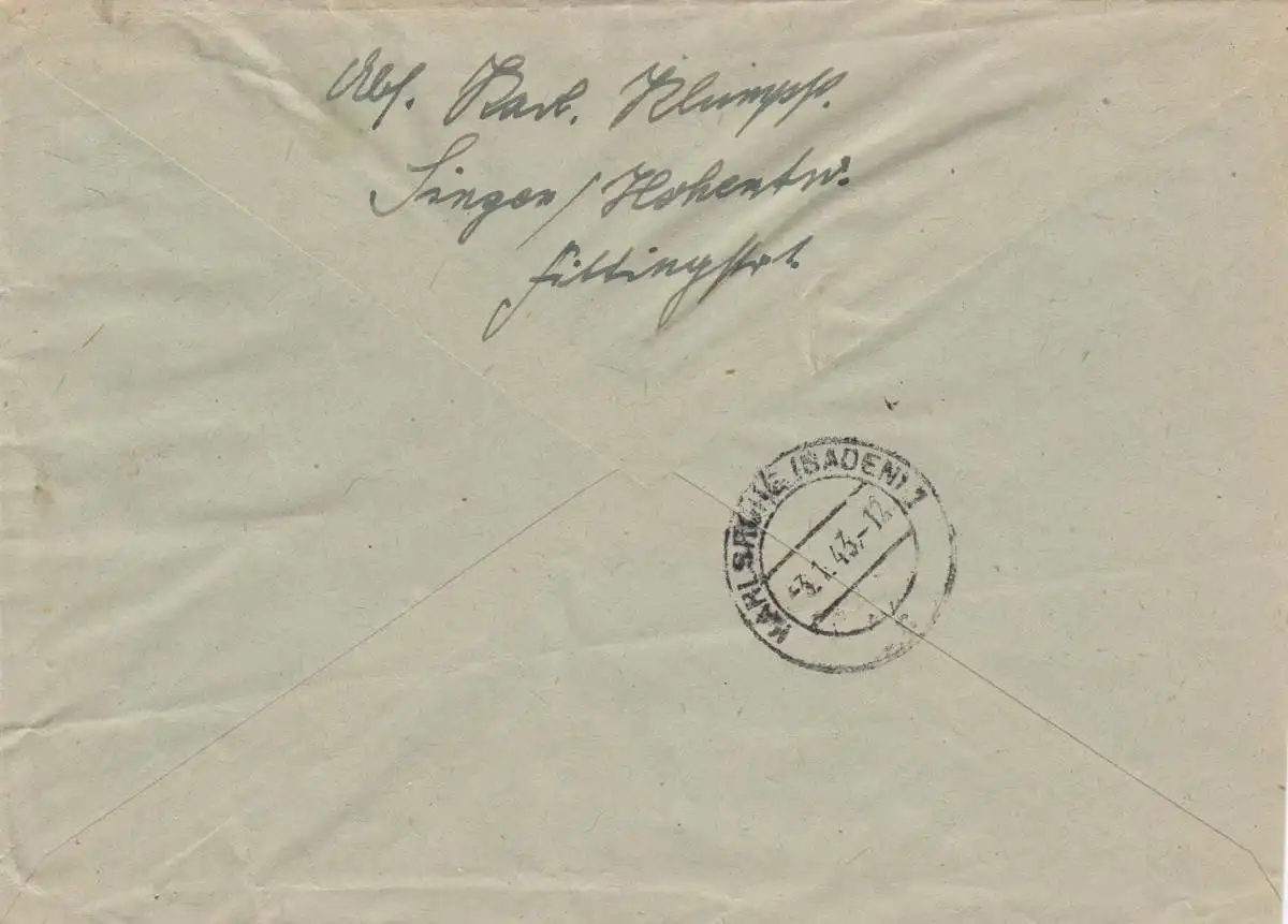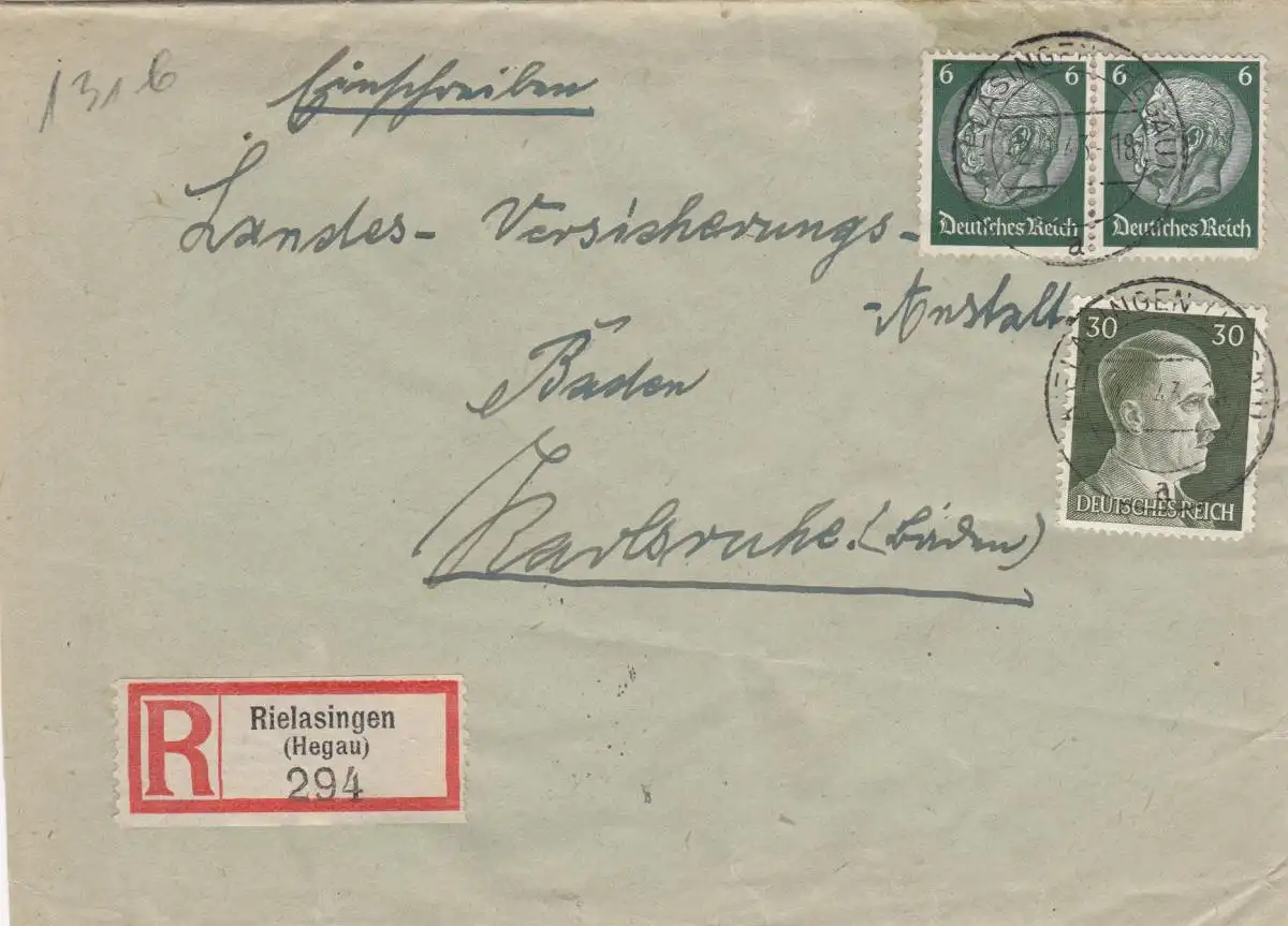 1943 Einschreiben Rielasingen, Hegau nach Karlsruhe