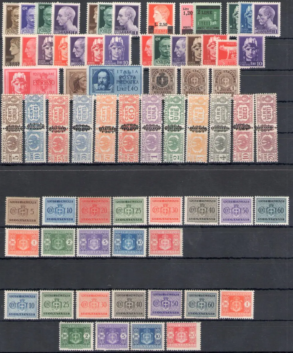 1943 Italien - Statthalterei - 69 Werte - postfrisch** - Es handelt sich um fast alle Serien der Statthalterei inklusive der Serie der Postpakete 48/59 und der Steuermarken 73/85 und 86/96 (Steuermarken mit filigranem Flügelrad) Sächsischer Katalog Euro 750 ++ Album bordeaux