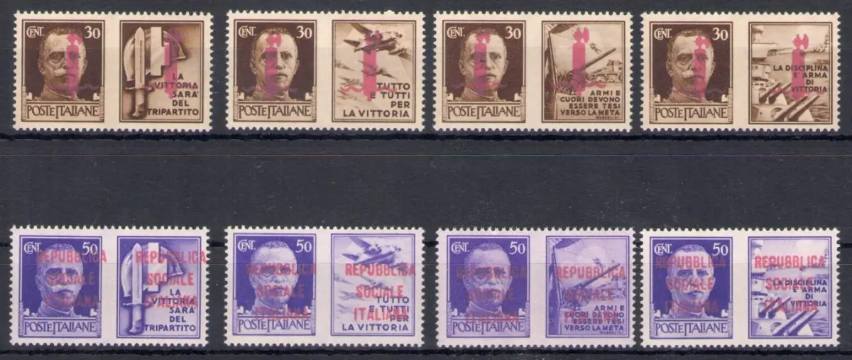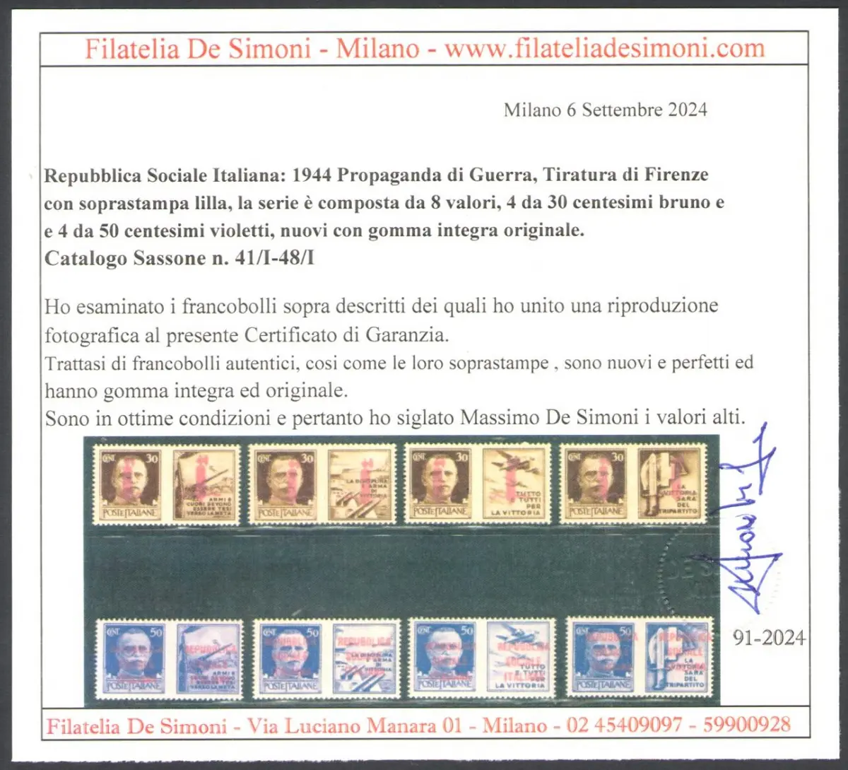 1944 Italienische Sozialrepublik, Kriegspropaganda Nr. 41/I-48/I - MNH** - Auflage Florenz Aufdruck Flieder Sächsischer Katalog PG Nr 41/I-48/I Euro 2250 - Rep Sociale Rosso Mio