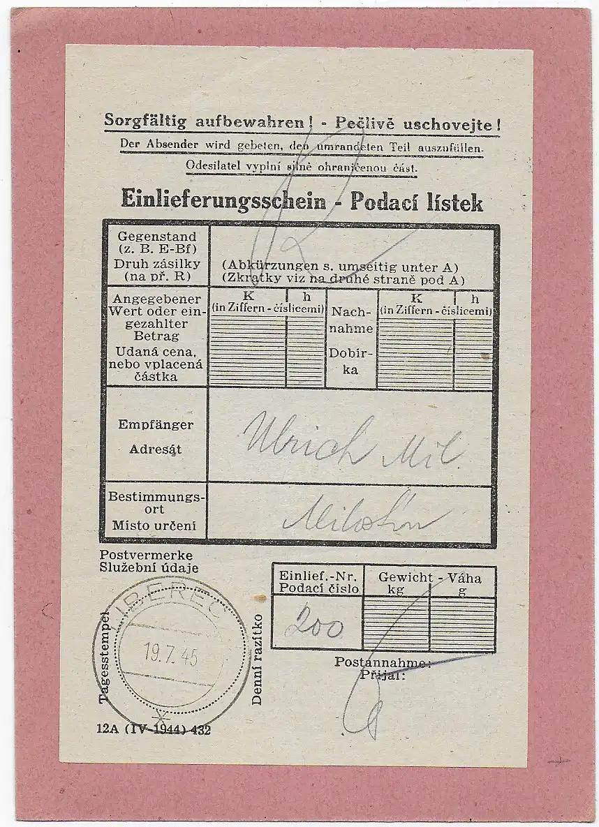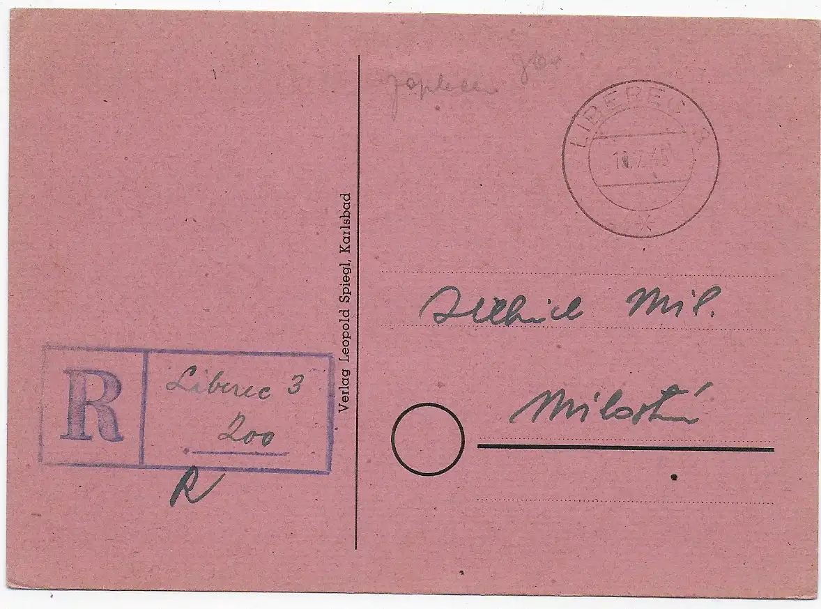 1945 Einschreiben Liberec : Deutscher B&M Einlieferungsschein verschickt