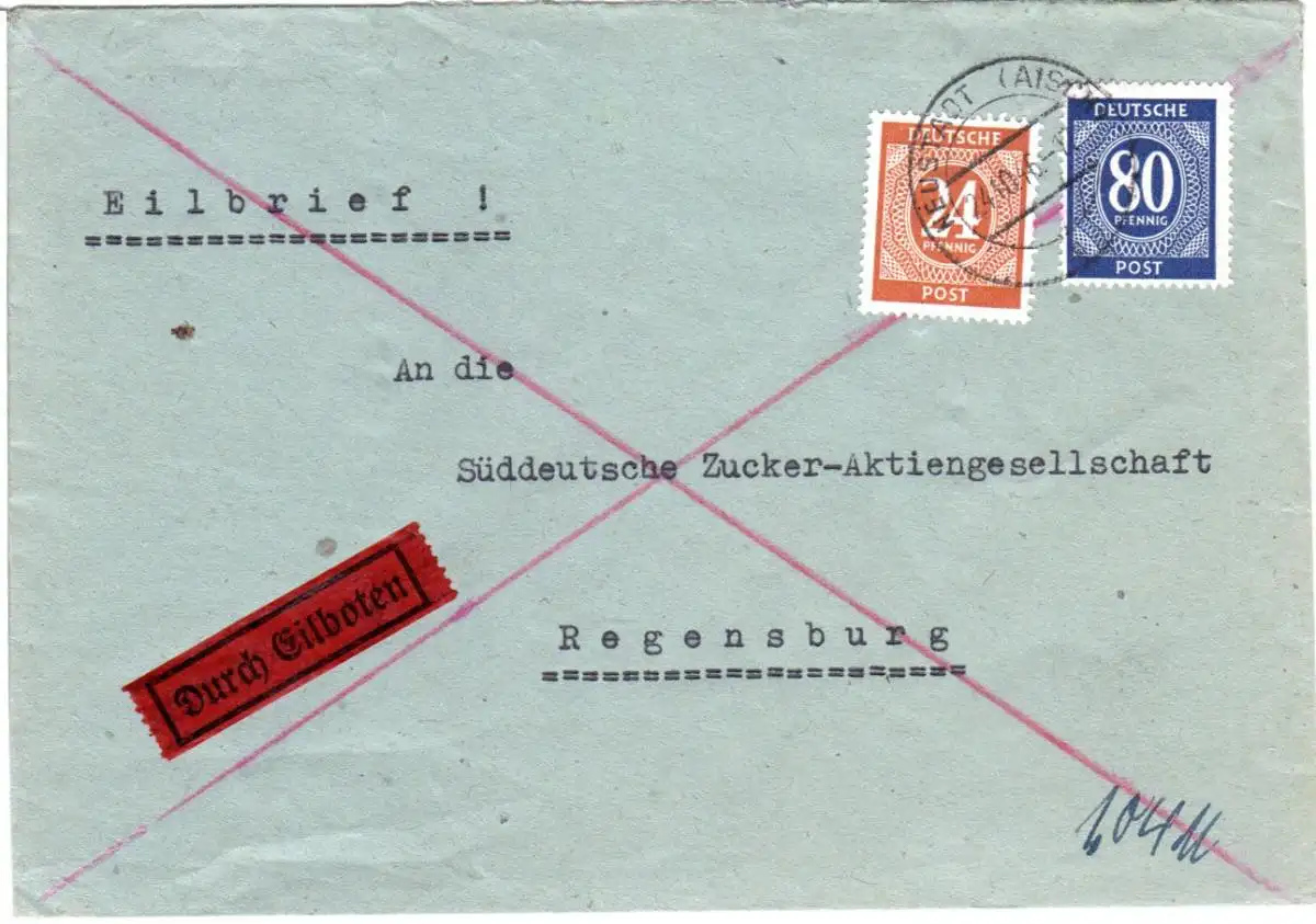1946, 24+80 Pf. auf Eilboten Brief v. Neustadt (Aisch) n. Regensburg