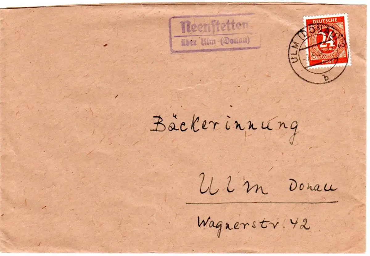 1946, Landpost Stpl. NEENSTETTEN über Ulm auf Brief m. 24 Pf.