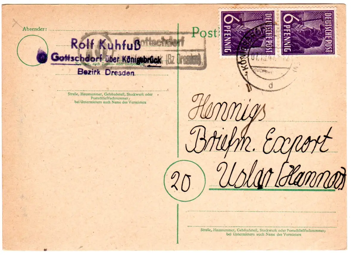 1947, Landpost Stpl. 10 GOTTSCHDORF über Königsbrück auf Karte m. 2x6 Pf.