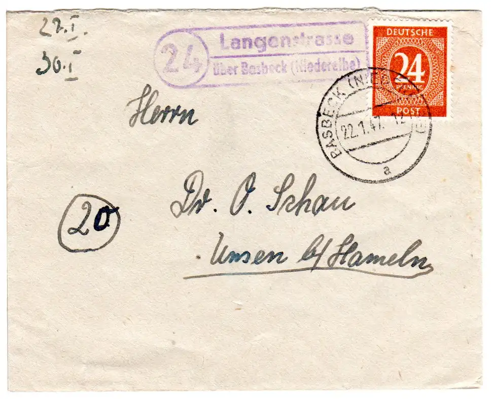 1947, Landpost Stpl. 24 LANGENSTRASSE über Basbeck auf Brief m. 24 Pf.