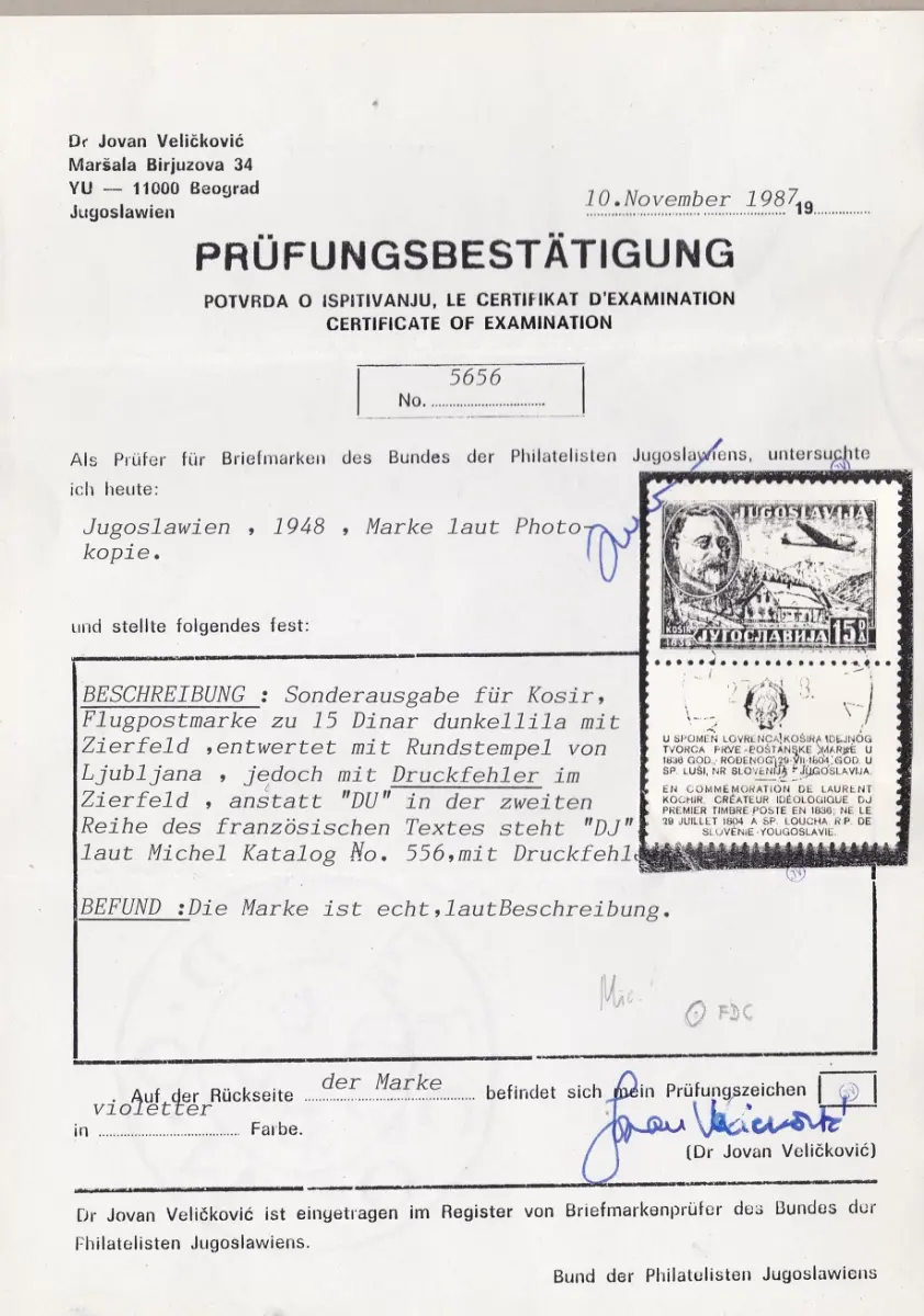 1948 JUGOSLAWIEN - Mi. Nr. 556 Zf Lovrenz Cosir 15 Din dunkelilla 'DJ statt DU Feld 18' Prüfungsbestätigung Velickovic - Velickovic Zertifikat A / Malta Blue Album
