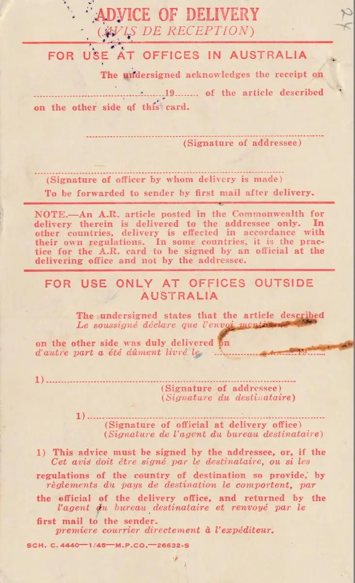 1949 Australien: nicht gebrauchter Rückschein- aber frankiert
