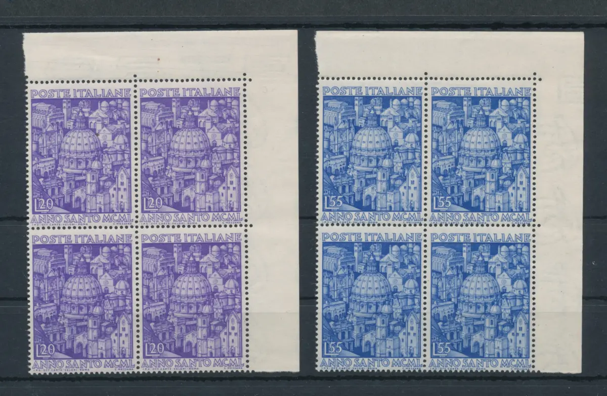 1950 Italien - Republik, Heiliges Jahr - 2 Werte, Nr. 620/21, sehr gute Zentrierung, postfrisch ** - Viererblock - rechter Bogenwinkel, Vollgummi und Original, perfekt.