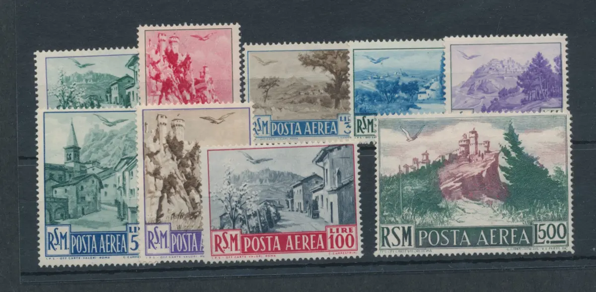 1950 SAN MARINO - Ansichten verschiedene Themen und Formate, Nr. 83/91, postfrisch ** Sächsischer Katalog Euro 475 - RSM-Album - rote Box - Lot Meer blaues Album