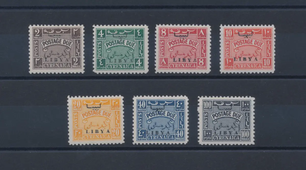 1951 LIBYEN Ausgabe für die Kyrenaika, Steuern Nr. 1-7 MNH ** Sächsischer Katalog Euro 500. A / Viertelblaues Album + Koloniebox
