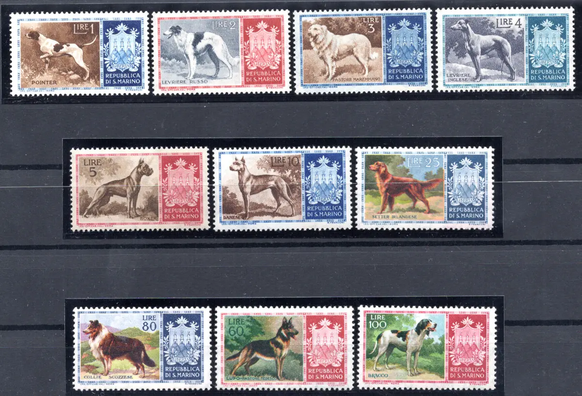 ** postfrisch - 1956 Hunde der Rasse Nr. 439/448 komplette Serie 10 Werte von ausgezeichneter Qualität und Zentrierung mit Vollgummi Katalog Euro62 Cod.2120/WEB