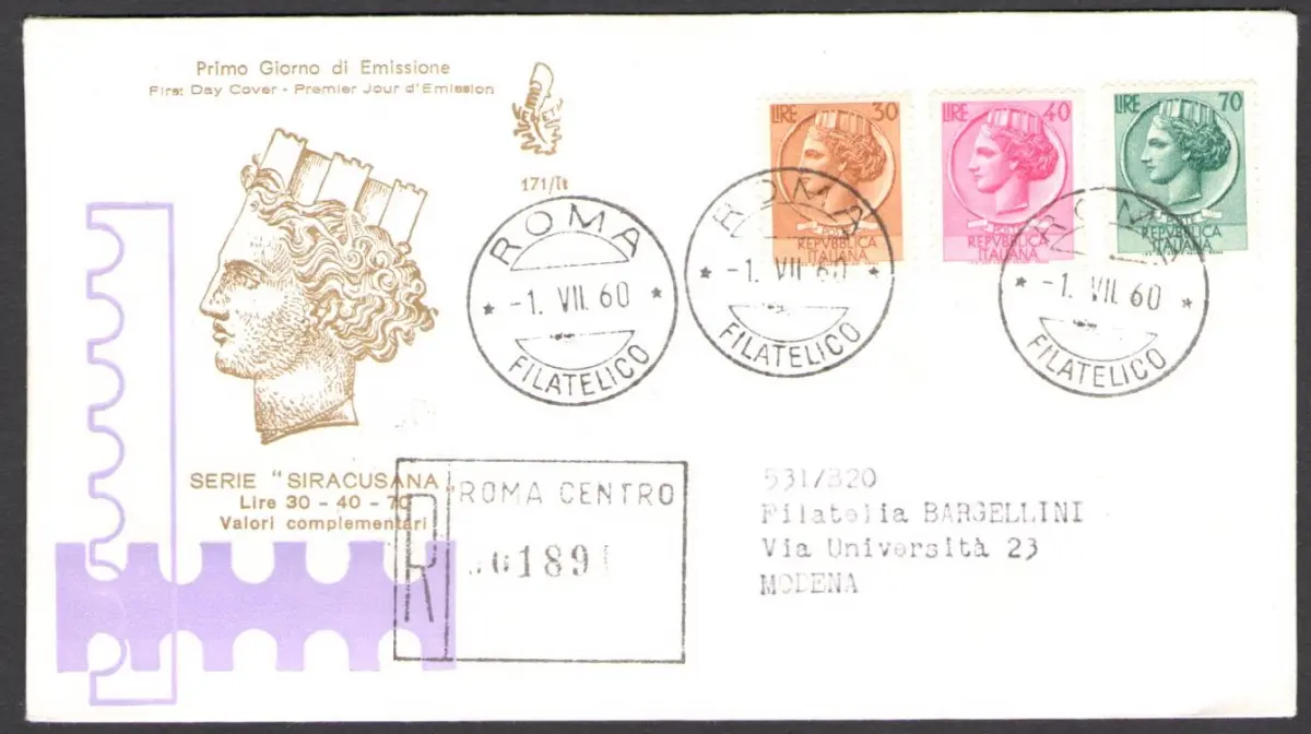 1960 REPUBBLICA - VENETIA Nr. 171/de Syrakus Lire 30-40-70 Einschreiben Stornierung der Ankunft in Richtung Modena Box Umschläge Venetien