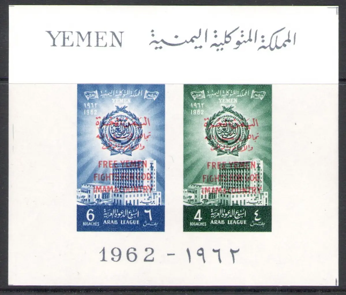 1962 JEMEN (Königreich) Diverse Kleinbögen MNH/** rot überdruckt in Beirut FREE YEMEN / FIGHTS FOR GOD / IMAM e COUNTRY A/M lotto 98
