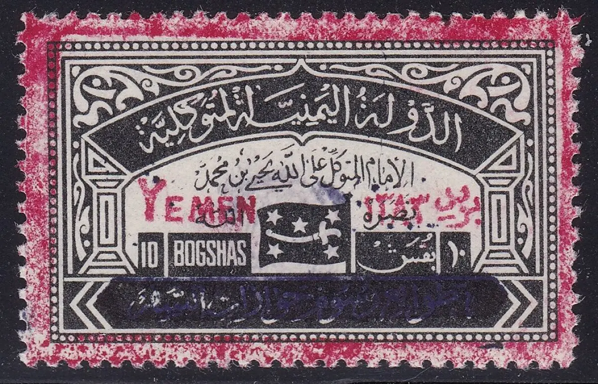 1963 JEMEN / Realistische Bürgerkriegsausgaben Ausgabe in Qara Konsularmarke mit Handstempel YEMEN in Englisch und POSTAGE 1383 Moslem Year in Arabisch in rot-orange mit schwarzem Balken auf alter Inschrift MNH/** Stanley Gibbons L 1.300 A/M Lot 98
