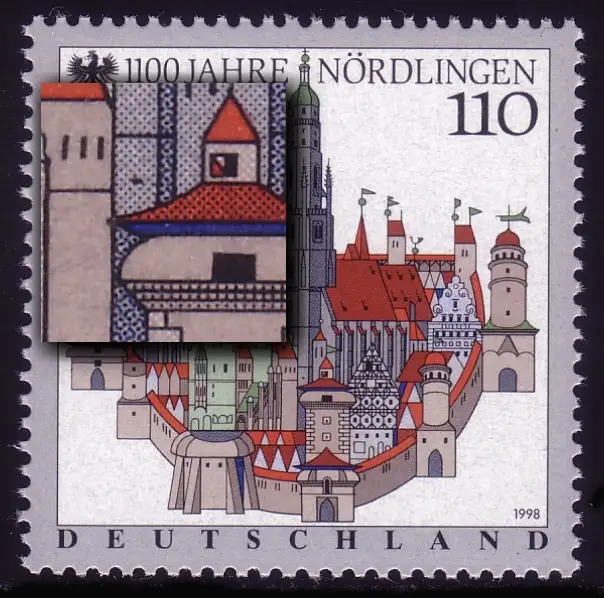 1965II Nördlingen - Plattenfehler schwarzer Fleck unten im Turm, Feld 4, **