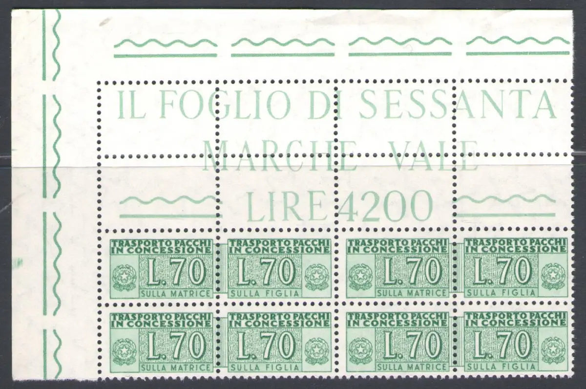 1966 Italien, Eckblock, Konzessionspakete 70 Lire grün Nr. 35 - postfrisch ** Ziffer auf den beiden Abschnitten, filigrane Sterne - Katalog Eckblöcke Euro 300 - blaues Rep-Album