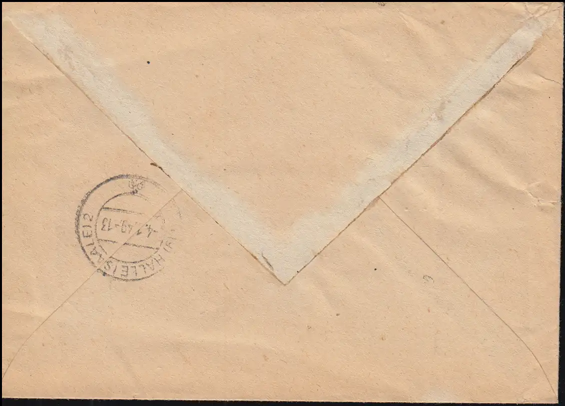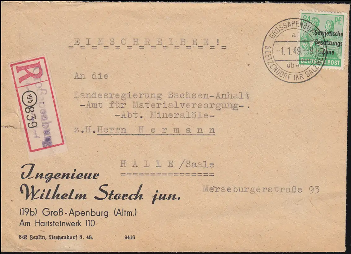 Not-Einschreibe-Zettel und Tagesstempel "GROSSAPENBURG über BETZENDORF (KR.SALZWEDEL) 1.1.49", Ankunftsstempel HALLE (SAALE) 2 bh - 4.1.49