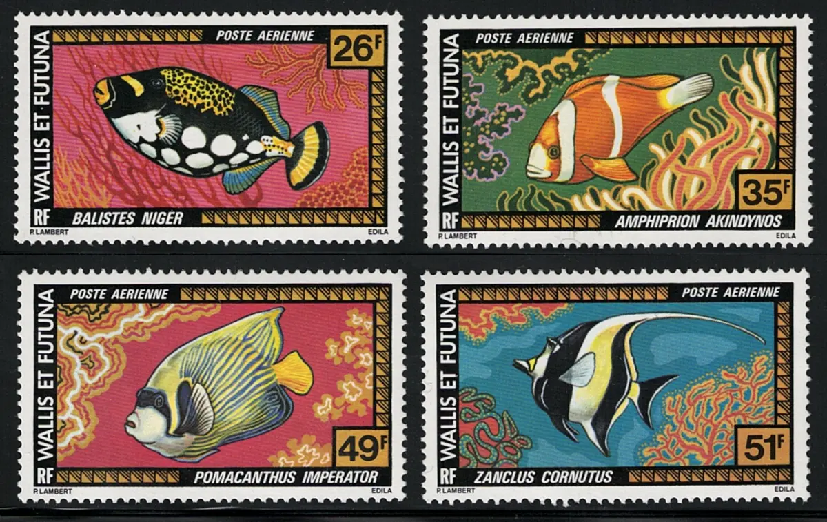 1978 Wallis et Futuna - Yvert Luftpost Nr. 76-79 - Fische - 4 Werte - MNH ** Yvert Katalog Euro 20 Themenbox 2 + Lot rotes Bolaffi Album Französische Kolonien