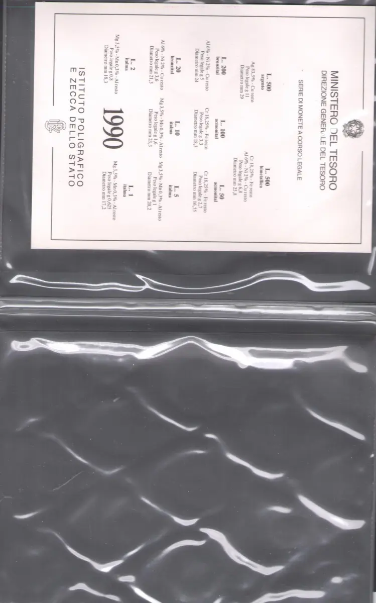 1990 Italien - Republik, Divisionaler kompletter Jahrgang FDC, Lire-Münzen mit der 500-Lire-Silbermünze, NEU UND PERFEKT IN ORIGINALVERPACKUNG und mit dem Beschreibungsbogen.