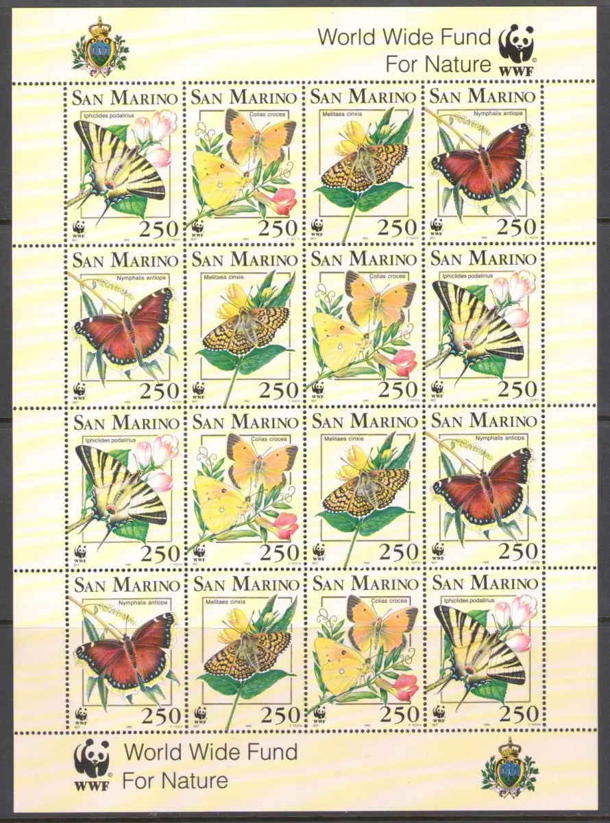 1993 San Marino, Minifoglio Schmetterlinge, WWF - Naturschutz - Kleinbogen mit 16 Werten - MNH ** Yvert Nr. 1328-1331 - Kompletter Kleinbogen Philatelie - neue Briefmarken - Republik San Marino - Sammeln - seltene Briefmarken - Zettel - San Marino ist ein gebirgiger Mikrostaat innerhalb italienischen Territoriums, im zentralen Norden des Landes. San Marino, eine der ältesten Republiken der Welt, hat einen Großteil seiner alten Architektur bewahrt. Die gleichnamige Hauptstadt liegt an den Hängen des Monte Titan und ist bekannt für die mittelalterliche Altstadt, die von Mauern umgeben ist, und die gepflasterten Gassen. Auf den drei Gipfeln des Berges erheben sich die drei Türme, Festungen aus dem 11. Jahrhundert.