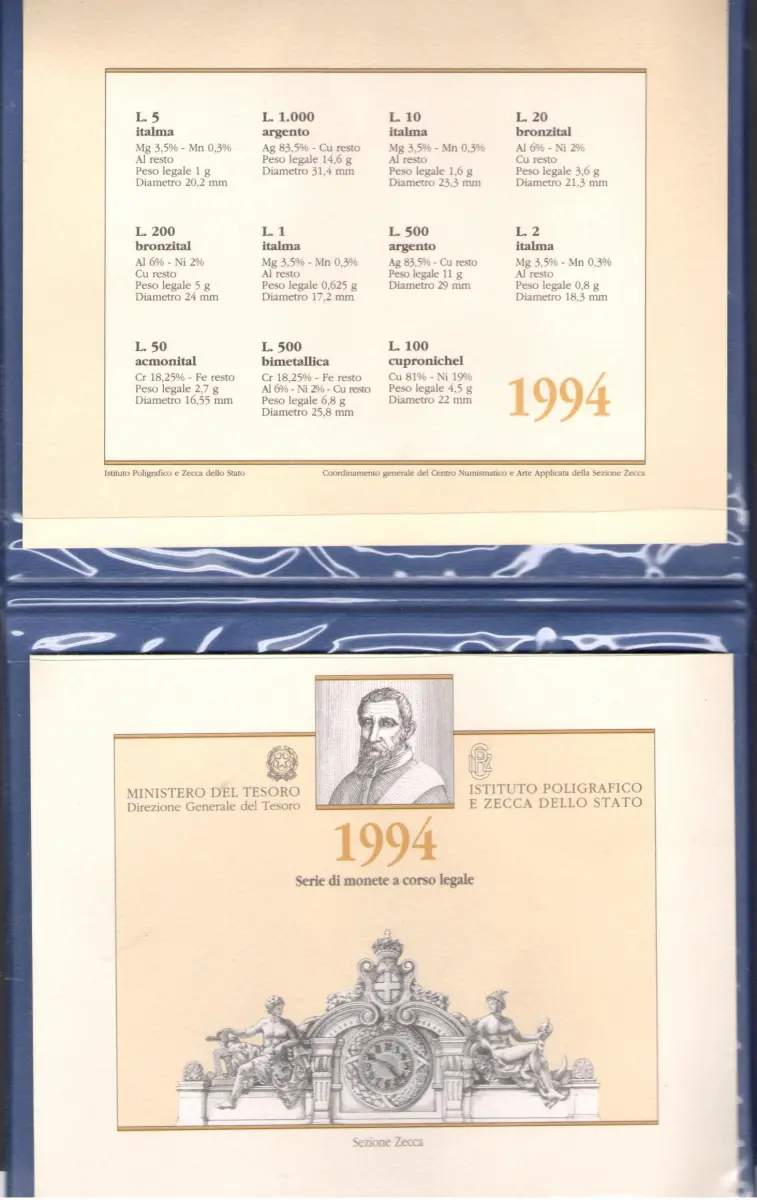 1994 Italien - Divisionsmünze kompletter Jahrgang, FDC, Lire-Münzen mit der 500-Lire-Silbermünze, NEU UND PERFEKT IN ORIGINALVERPACKUNG und mit dem Beschreibungsbogen.