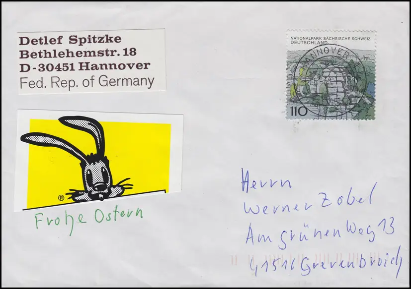 1997 Sächsische Schweiz 110 Pf. Elbsandsteingebirge EF Brief Hannover 5.4.2001
