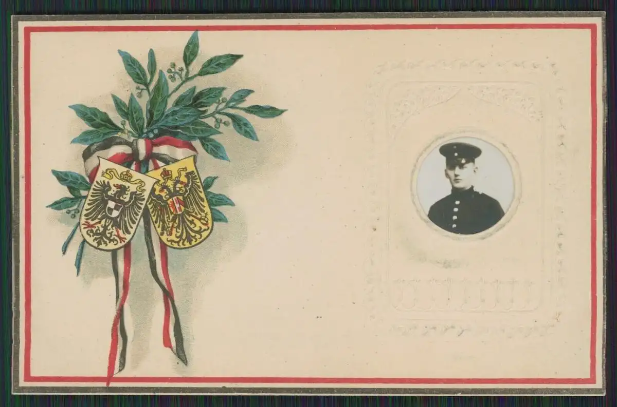 1.WK Portrait in AK montiert Schleife bindet Blumenkranz Wappen Reichsadler 1916