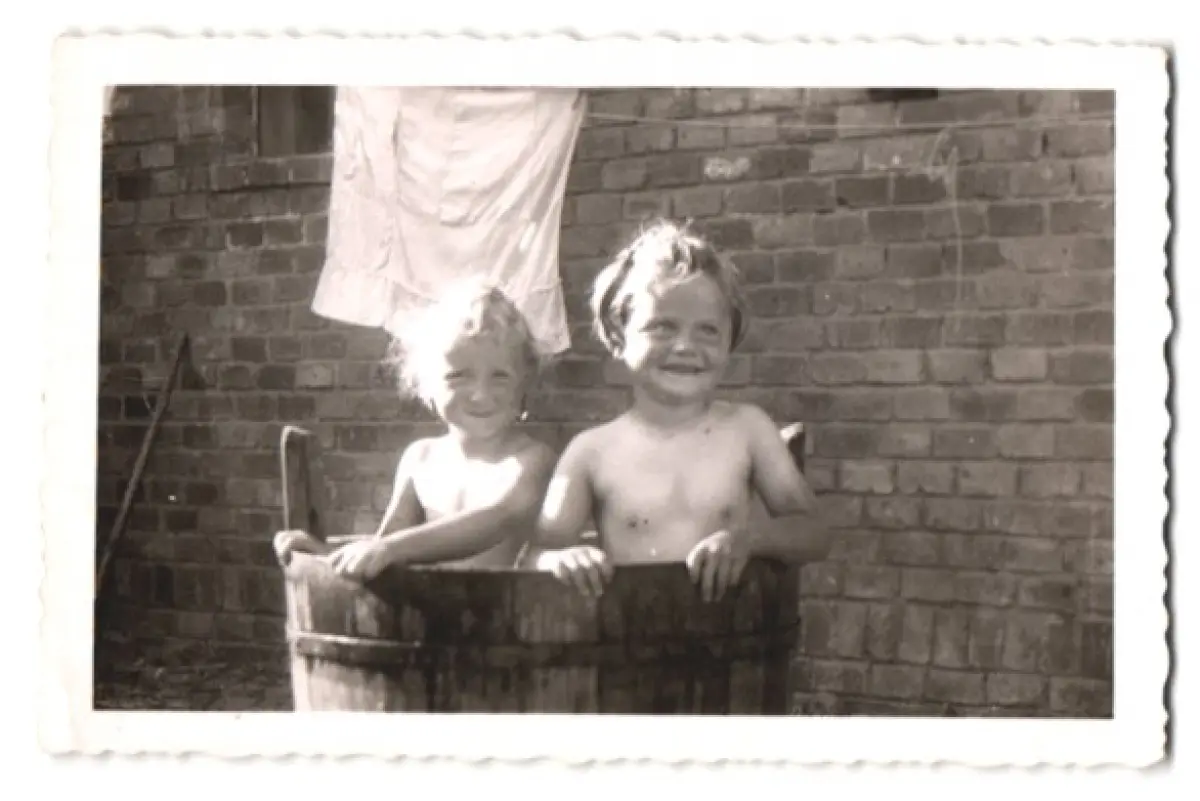 2 Fotografien zwei niedliche Kinder beim Baden im Badezuber