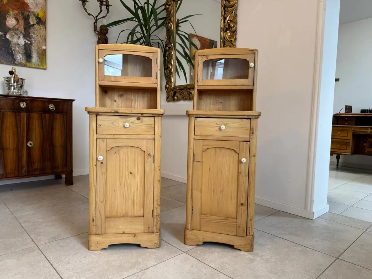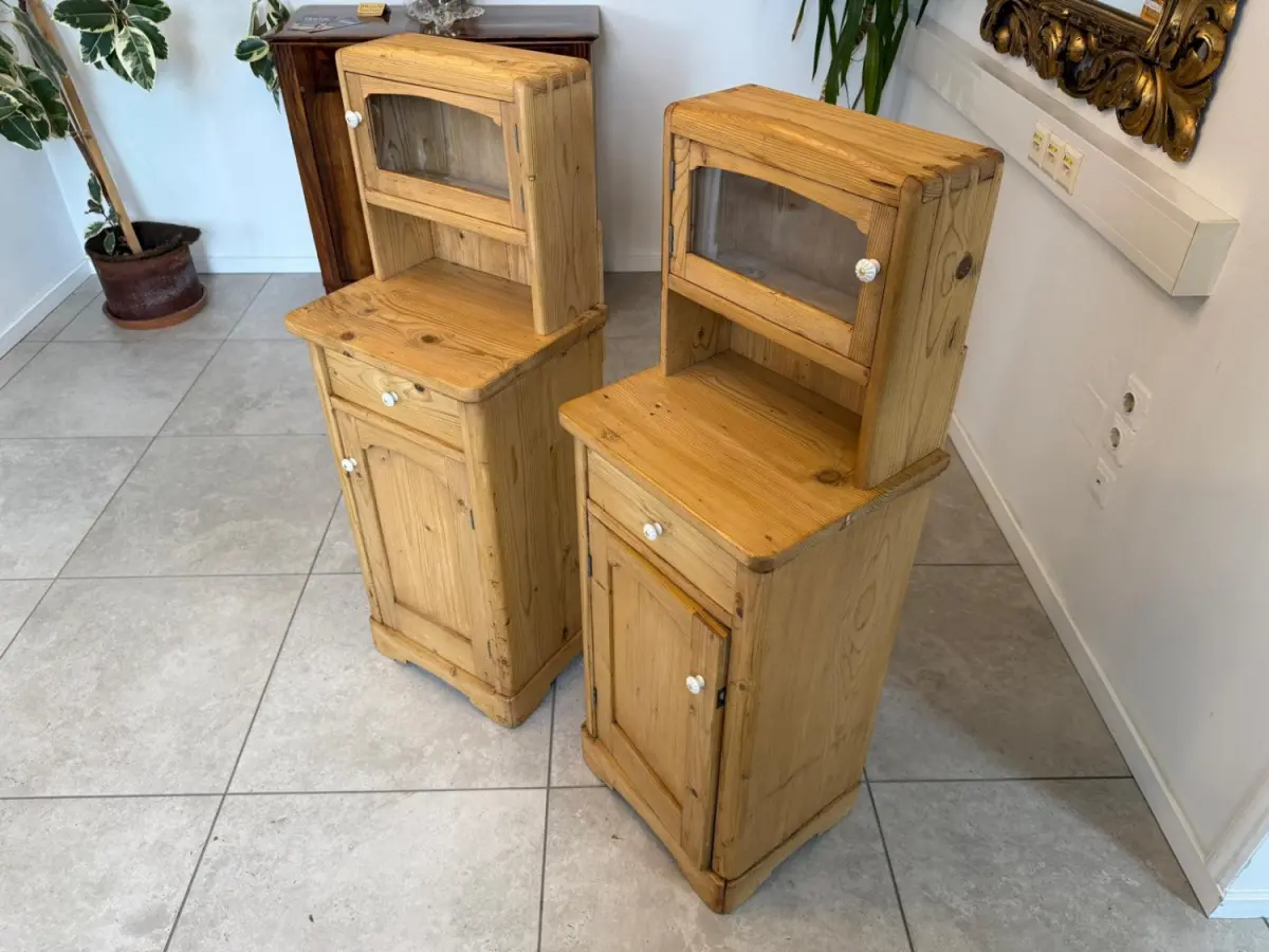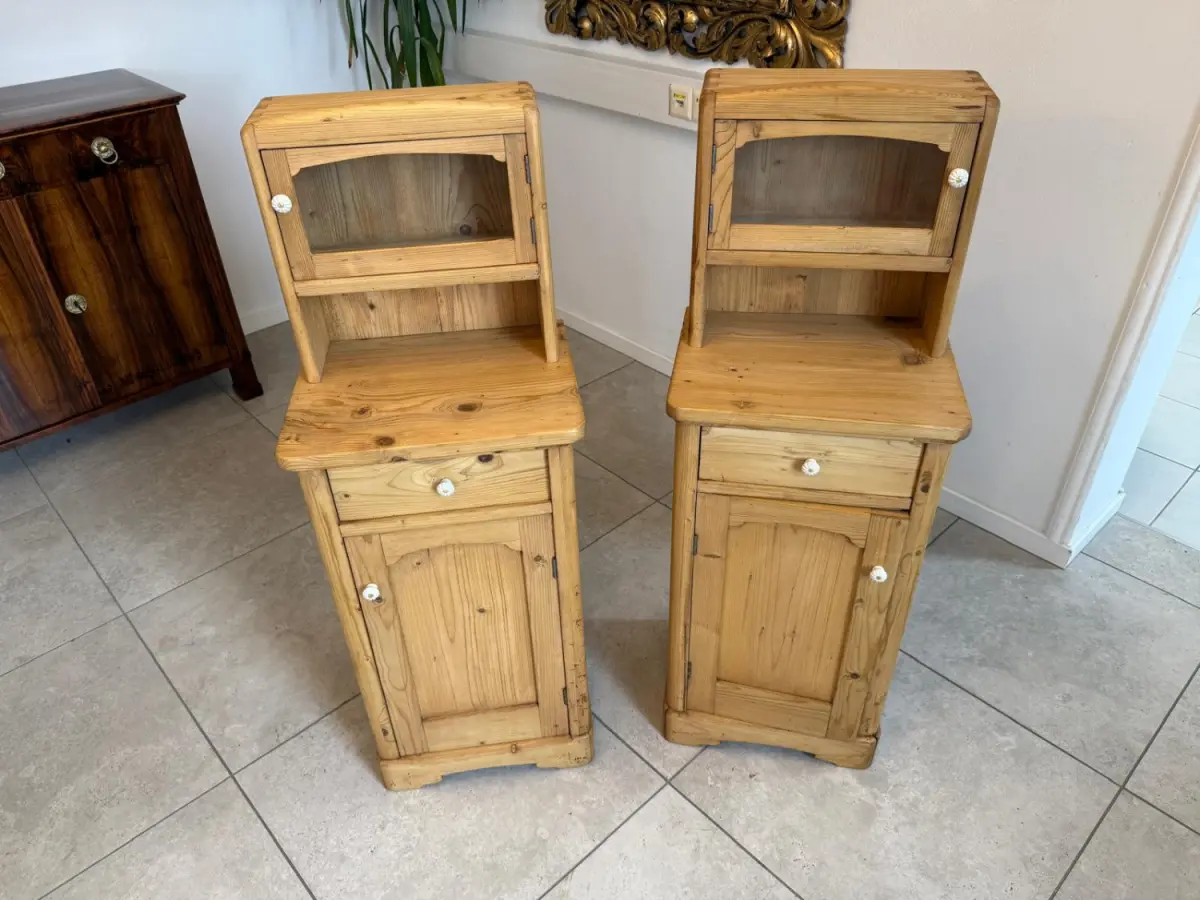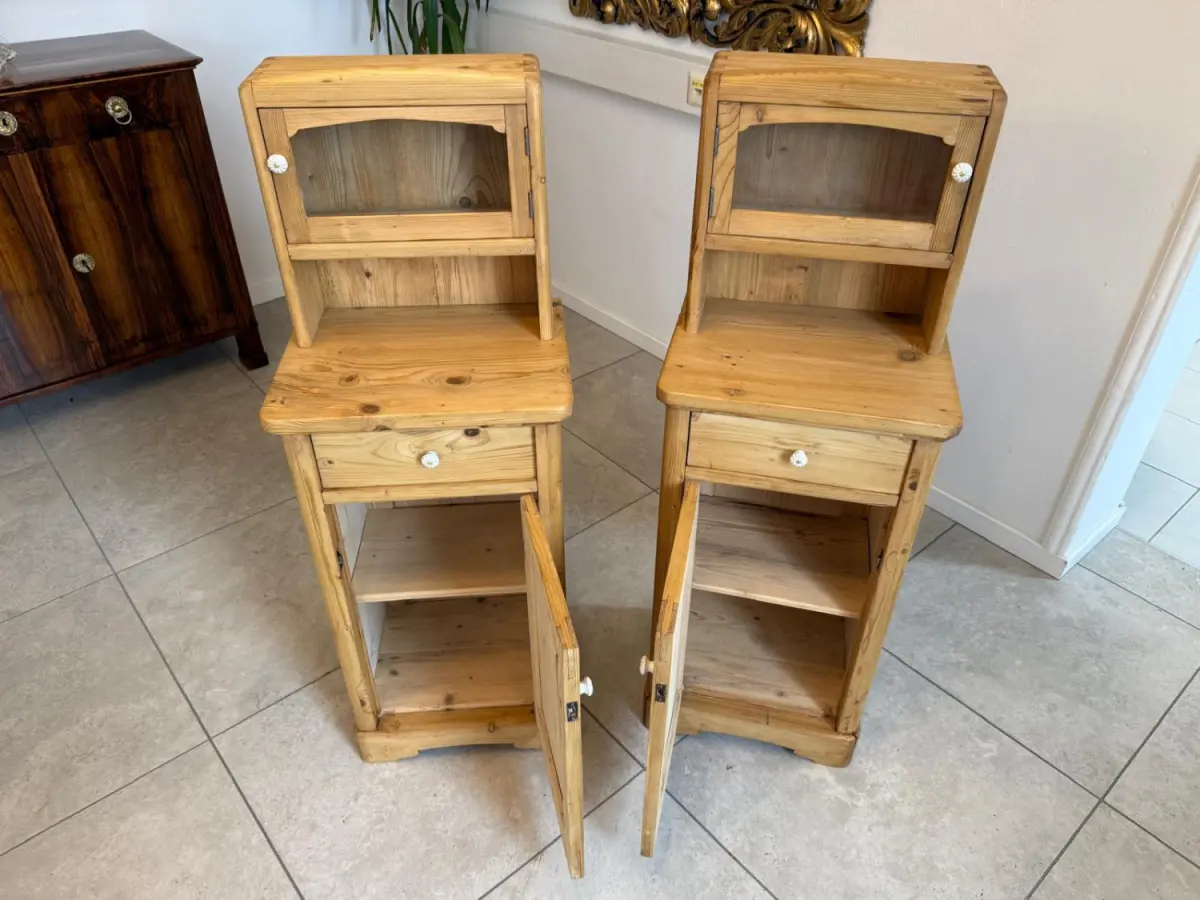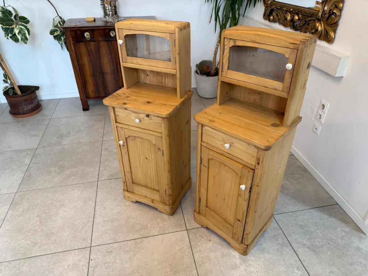 Hier handelt es sich um 2 bezaubernde, massive bäuerliche Nachtkästchen aus Fichtenholz aus der Zeit um 1900.