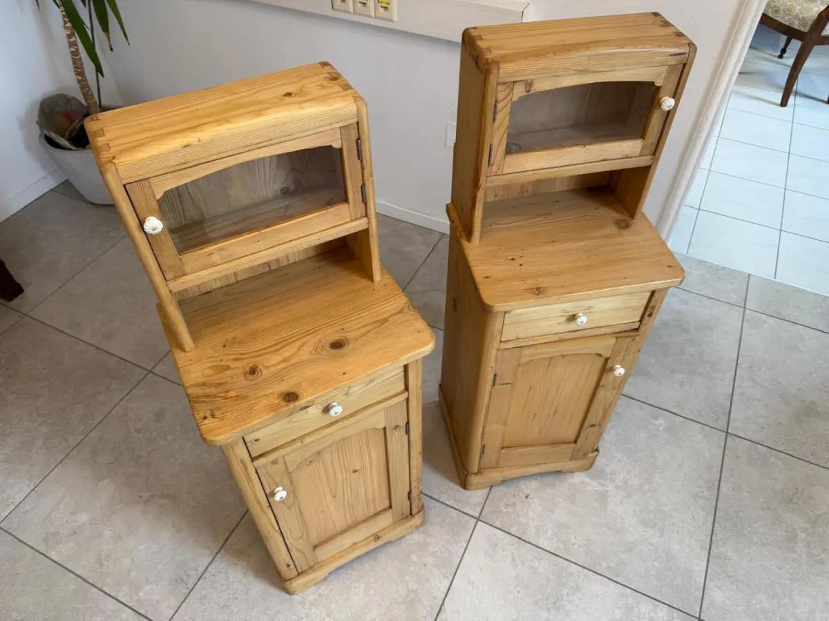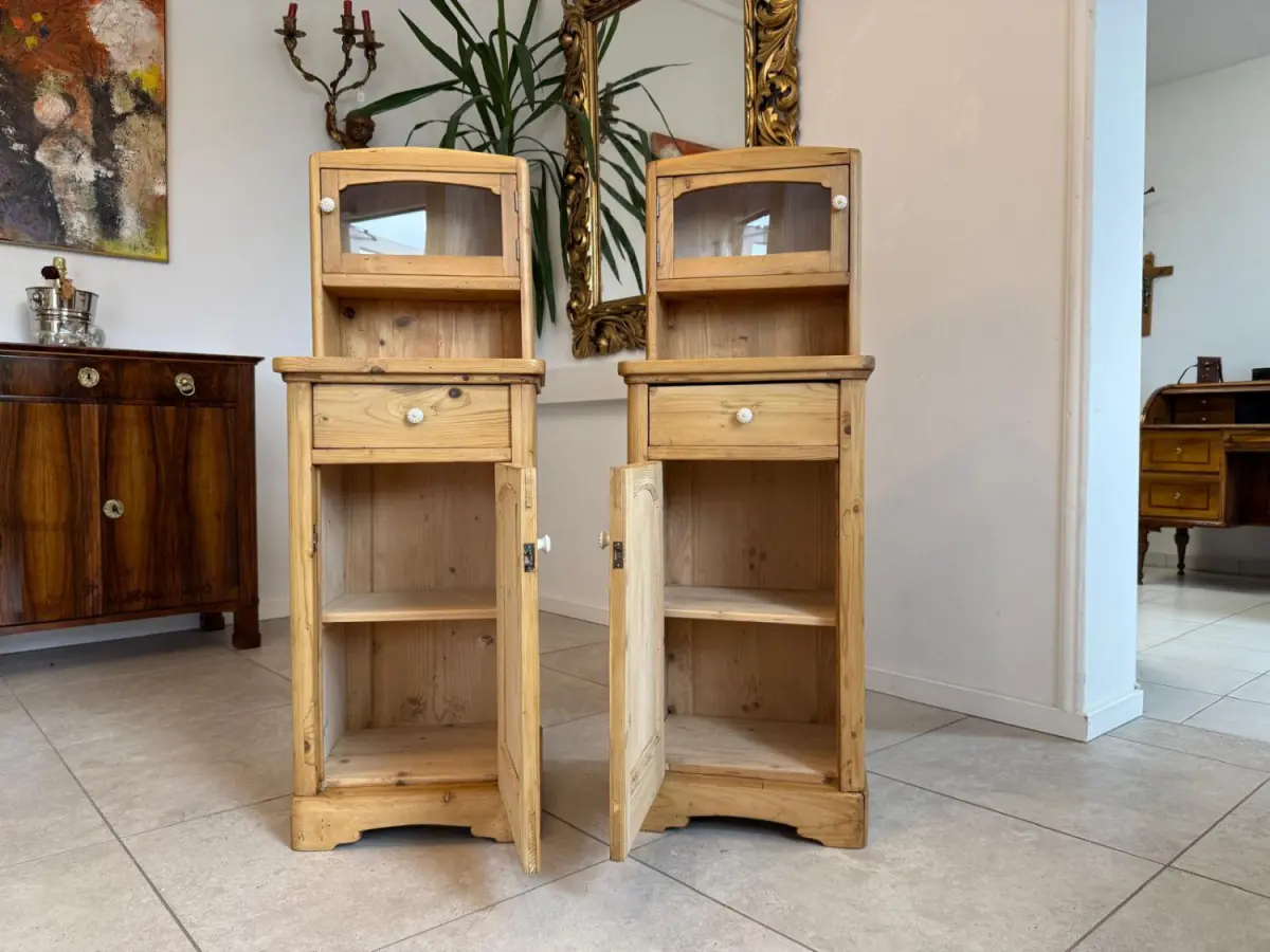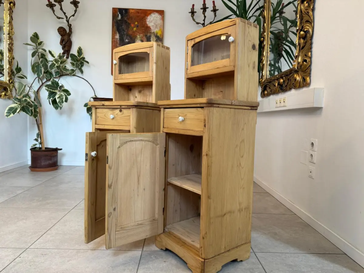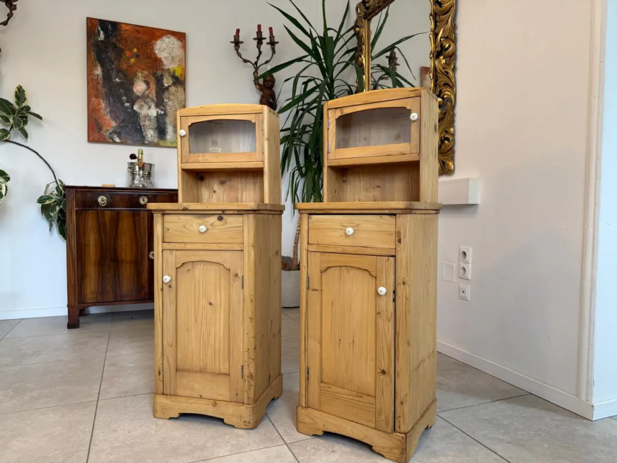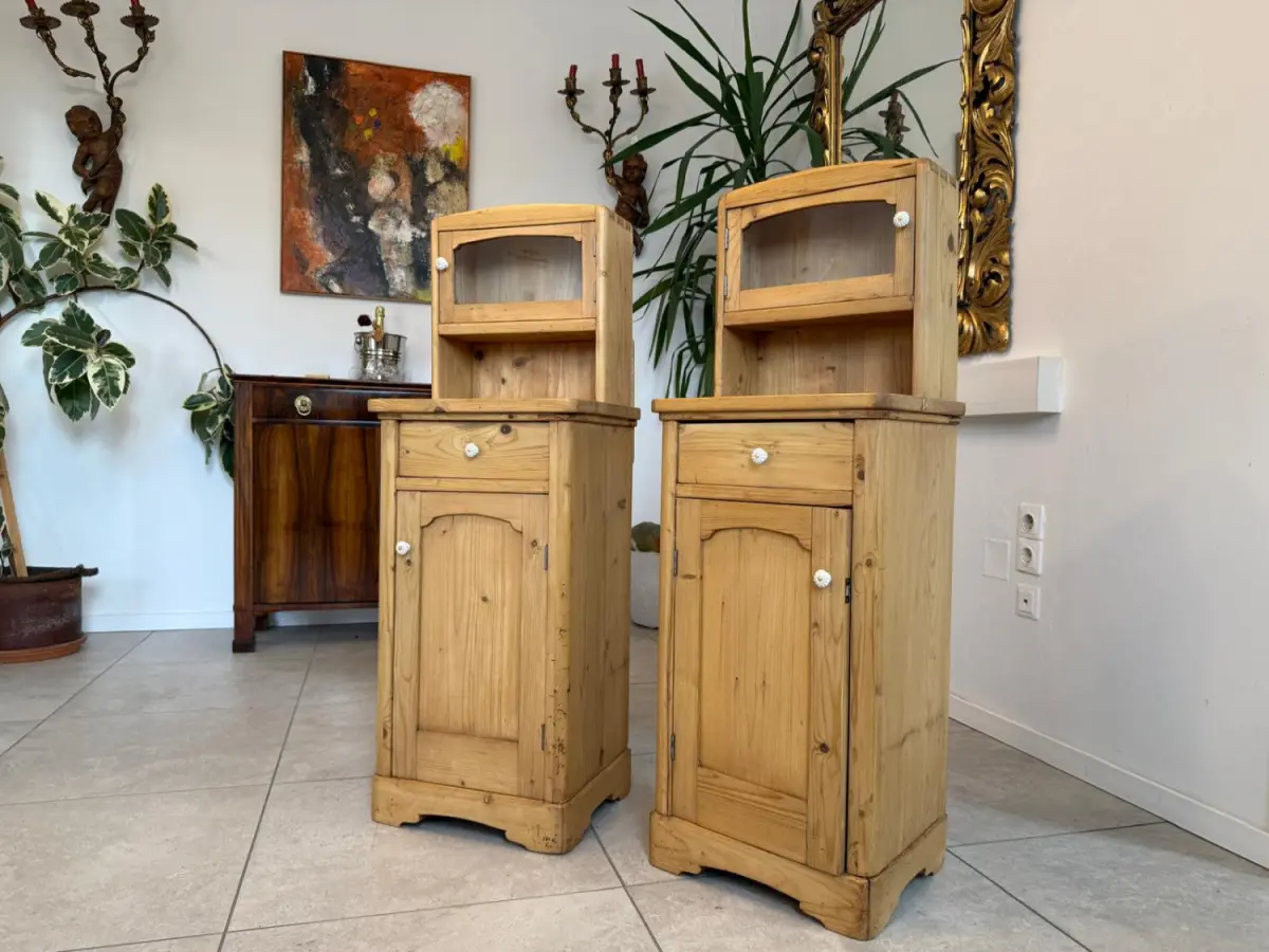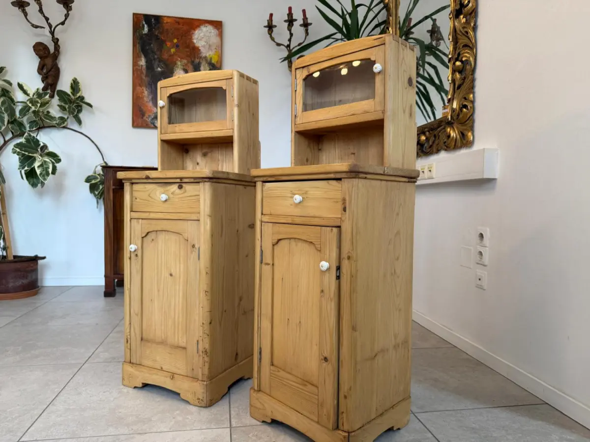Hier handelt es sich um 2 bezaubernde, massive bäuerliche Nachtkästchen aus Fichtenholz aus der Zeit um 1900.