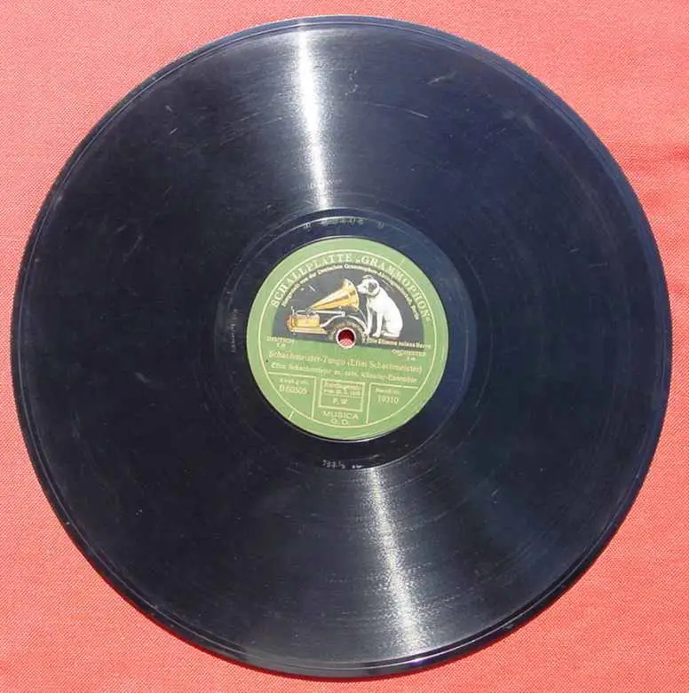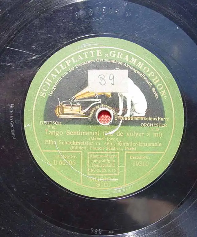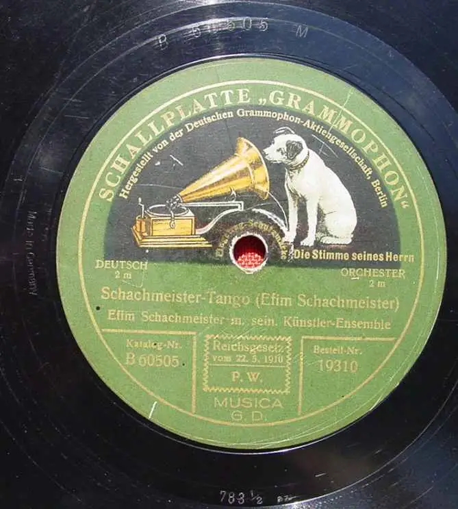 Efim Schachmeister. Titel A: "Schachmeister-Tango" E.Sch. mit seinem Künstler-Ensemble. Manuel Joves. Titel B: "Tango Sentimental" E. Sch. mit seinem Künstler-Ensemble. Sehr alte Schellack-Schallplatte Deutsche Grammophon-AG, Berlin. Durchmesser 30,5 cm. ! Alle angebotenen Schellack-Schallplatten sind mehr oder weniger gebraucht. Zum Teil auch mit starken Gebrauchsspuren. Auch können sie etwas verschmutzt sein. Die Platten sind nicht probeabgespielt. Die Schellack-Platten sind Originale der damaligen Zeit und sind auch sehr beliebt nur als Nostalgieobjekt. Somit ist dieses Angebot für jene Sammler vermutlich nicht geeignet, die besonderen Wert legen auf exzellenten Zustand sowie auf einwandfreie Musikwiedergabe. Sorgfältige Verpackung !