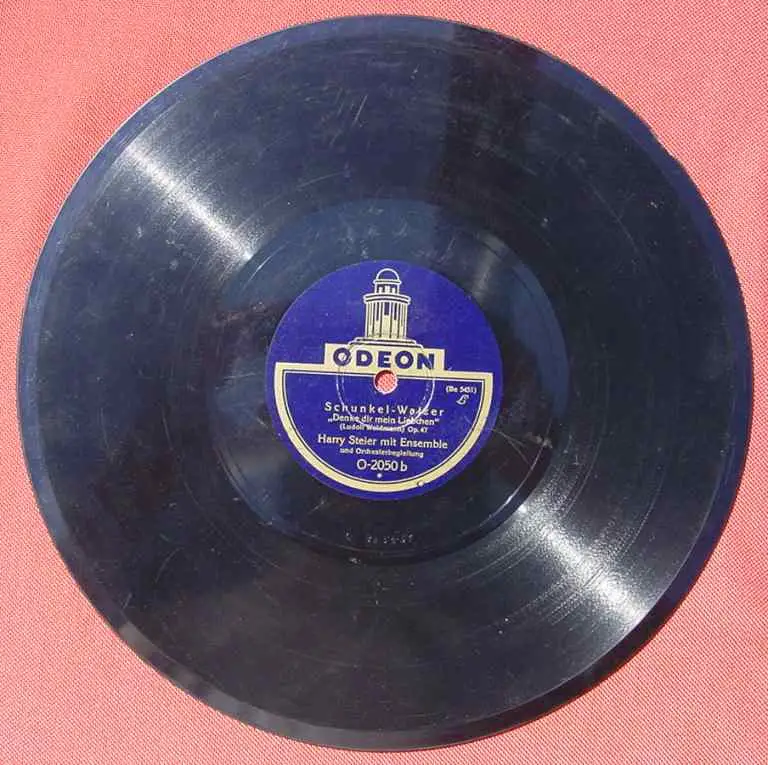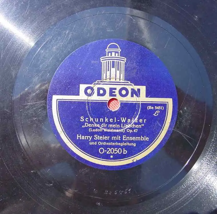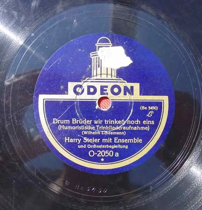 Harry Steier mit Ensemble. Titel A: "Drum Brüder wir trinken noch eins" (Humoristische Trinkliederaufnahme / Wilhelm Lindemann). Titel B: "Denke dir mein Liebchen" (Schunkel-Walzer / Ludolf Waldmann). Fa. ODEON. Alte Schellack-Schallplatte. Durchmesser ca. 25 cm. ! Alle angebotenen Schellack-Schallplatten sind mehr oder weniger gebraucht. Zum Teil auch mit starken Gebrauchsspuren. Auch können sie etwas verschmutzt sein. Die Platten sind nicht probeabgespielt. Die Schellack-Platten sind Originale der damaligen Zeit und sind auch sehr beliebt nur als Nostalgieobjekt. Somit ist dieses Angebot vermutlich für jene Sammler nicht geeignet, die besonderen Wert legen auf exzellenten Zustand sowie auf einwandfreie Musikwiedergabe. Sorgfältige Verpackung !
