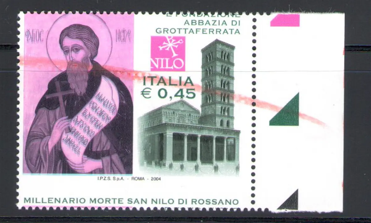 2004 ITALIEN - REPUBLIK, San Nilo Farben geändert und Verzahnung nach oben verschoben, der Schriftzug Millennium di San Nilo befindet sich unten, der übliche orangefarbene Bleistiftstrich des Druckers zum Verwerfen der Briefmarke, Nr. 2426 MNH ** VARIETÄT Jahrtausend des Todes von San Nilo di Rossano, VOLLGUMMI Sächsischer Spezialkatalog Euro NICHT KATALOGISIERT