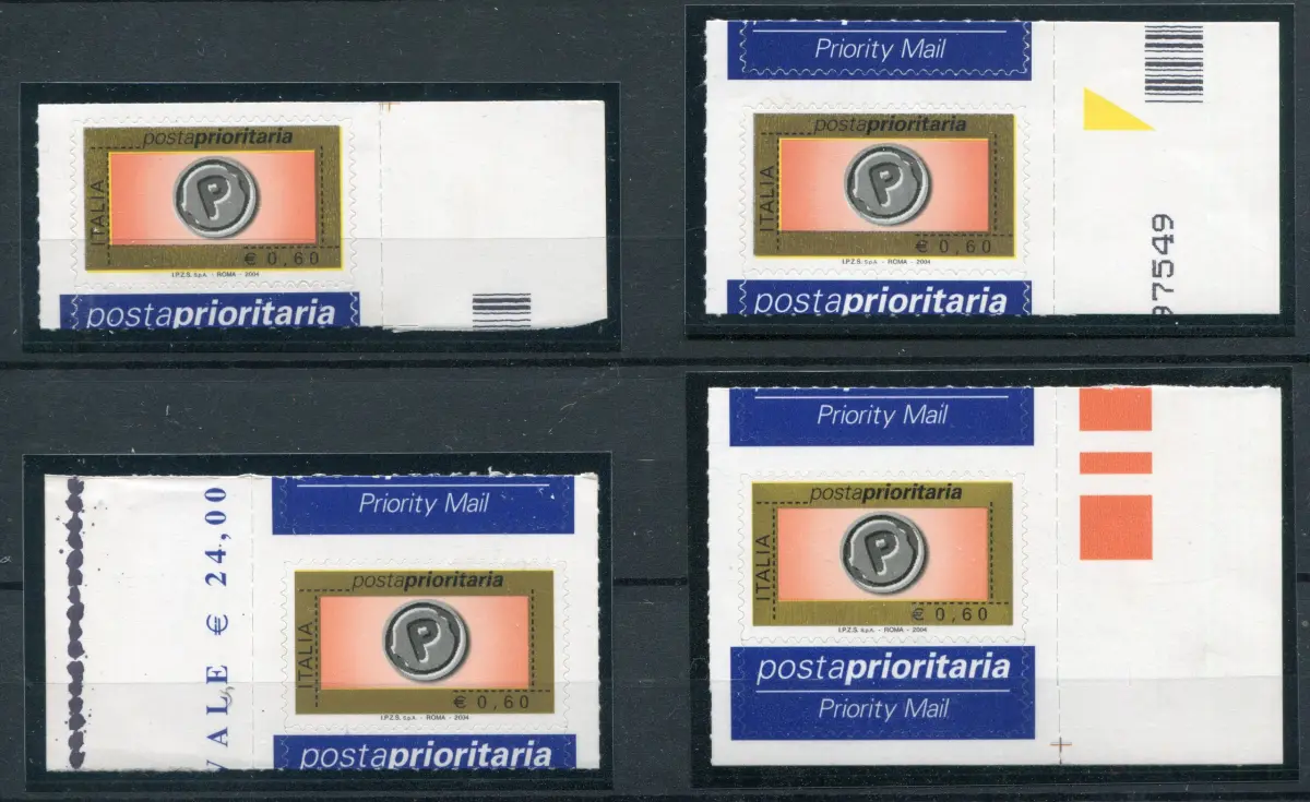 2004 Priority Post Euro 0,60 vier Sorten Vollgummi - MHN - - 2004 Priority Post Euro 0,60 Nr. 2747 vier Exemplare mit stark senkrecht verschobener Spur - Marken durch Position des Priority Post Labels unterschiedlich, ein Exemplar hat auch schwarze Punkte am Rand Cod. 873/14